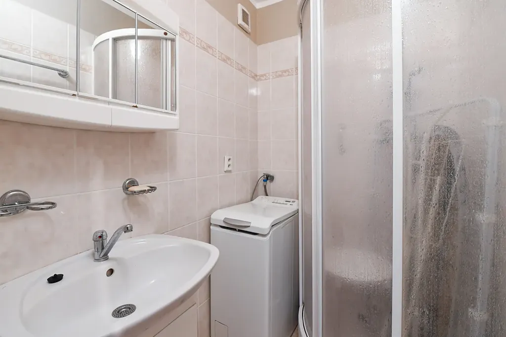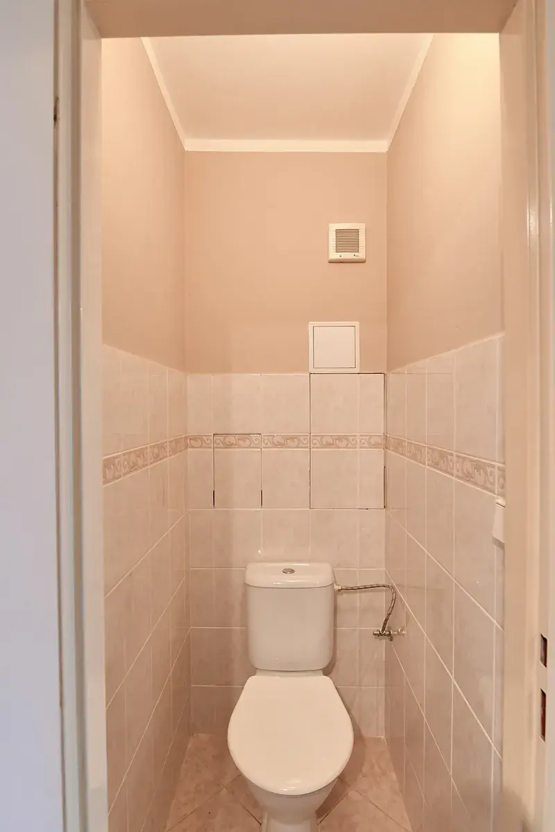 Byt disponuje klasickým a velmi praktickým uspořádáním, vstupní předsíň, vlevo samostatné WC, samostatná koupelna se sprchovým koutem (jádro je zděné, stoupačky plastové s měřidly teplé i studené vody). Následuje ložnice a obývací pokoj s kuchyňským koutem (kombinovaný sporák, lednice s mrazákem).