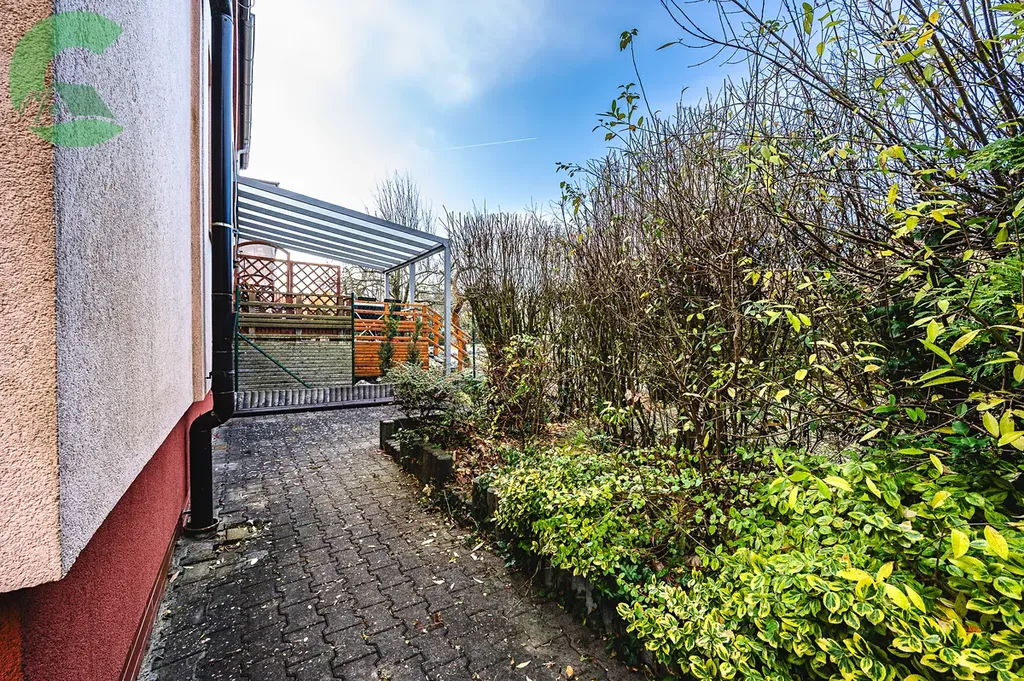 Celková výměra pozemku činí 455 m², zastavěná plocha 106 m². Zahrada je příjemná, dostatečně velká a orientovaná do klidného vnitrobloku – s několika stromy, keři a velmi příjemným soukromím. Parkování je možné na vlastním pozemku pro 2 osobní vozy + další možnost v garáži (vhodná pro menší vůz, motorku, kola či sklad).