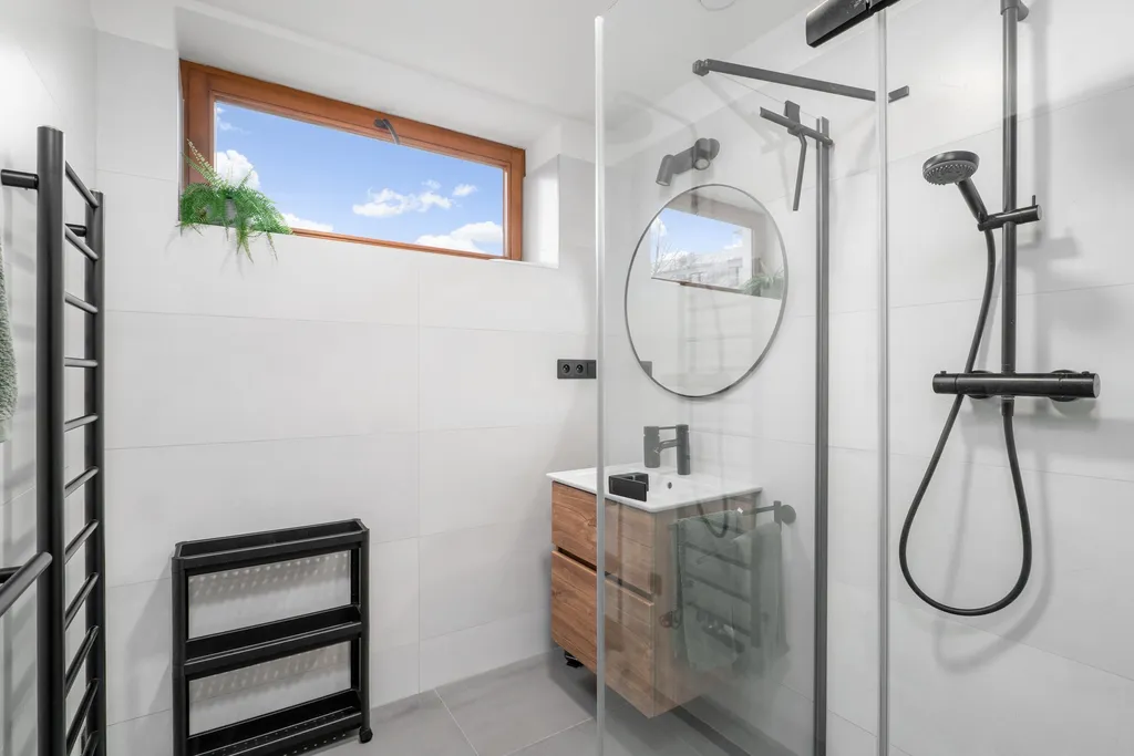 Koupelna v prémiovém standardu: sanita Villeroy & Boch, sprchový kout HÜPPE, podomítkové WC TECE
