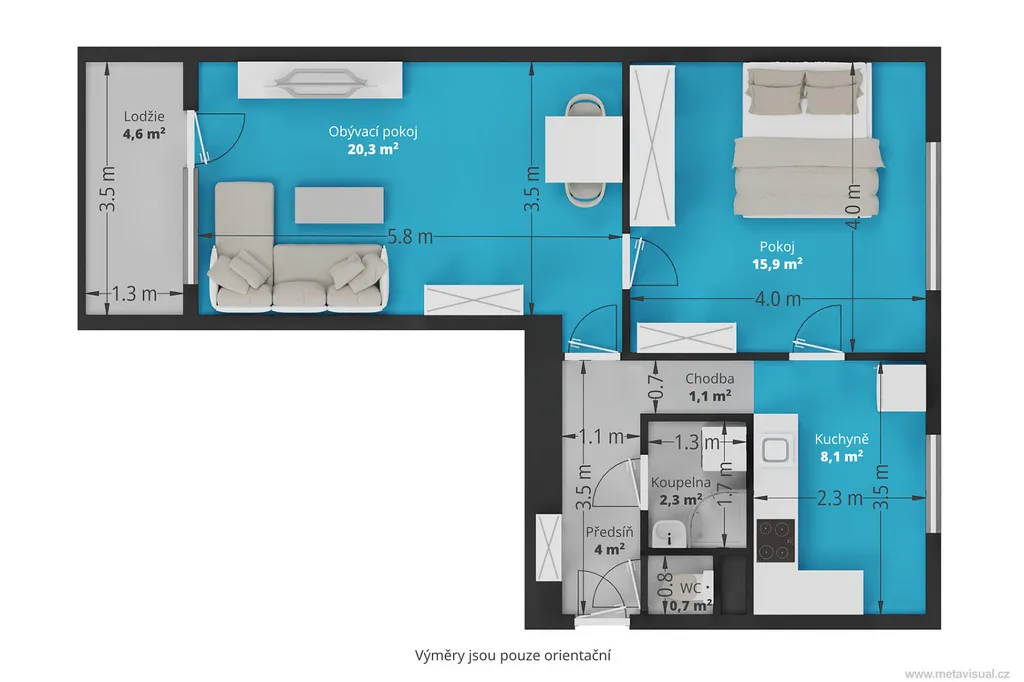 Do bytu vás přivítá předsíň, ze které jsou vstupy do jednotlivých místností, viz. přiložený orientační půdorys.