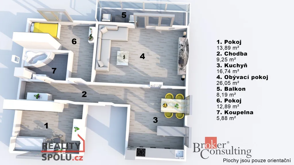 Uvedené výměry jsou orientační. Veškeré zveřejněné údaje mají pouze informativní charakter a nepředstavují nabídku ve smyslu § 1731 nebo § 1732 občanského zákoníku, ani veřejný příslib dle § 1733 občanského zákoníku.