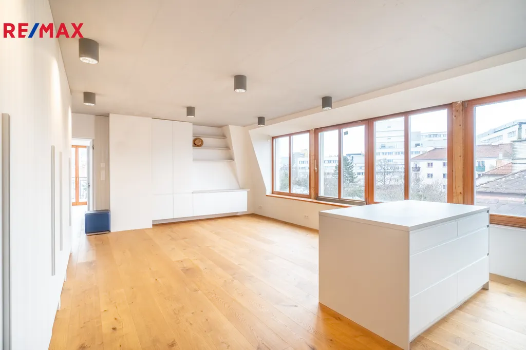 Dispozice 5+kk působí mimořádně vzdušně. Dominantou je prostorný obývací pokoj s kuchyňským koutem, který nabízí dostatek místa pro společný život i zázemí pro rodinu. Na obytnou část navazují čtyři samostatné pokoje využitelné jako ložnice, dětské pokoje nebo pracovna. Součástí bytu je koupelna, samostatná toaleta a prostorná vstupní hala. Velká okna dodávají prostoru světlo a příjemnou atmosféru.