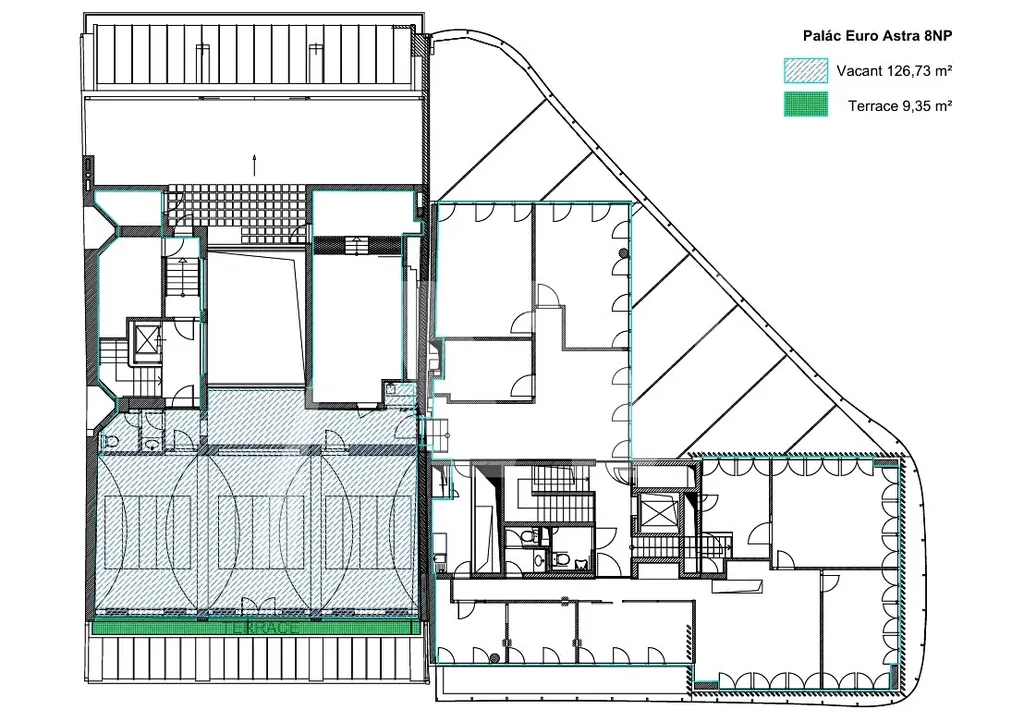 Nabízíme k pronájmu zajímavou kancelář umístěnou v nejvyšším podlaží (7.patro) budovy Palác Astra o velikosti cca 133 m2 odhadem pro 8-12 osob spolu s užší podélnou terasou o velikosti 9,35 m2 s výhledem na Václavské náměstí: