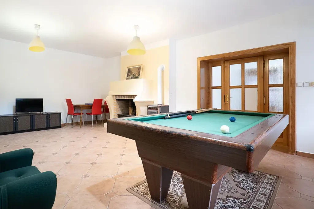 Prostorné společenské místnosti s krbem, kulečníkem ideální pro rodinná setkání