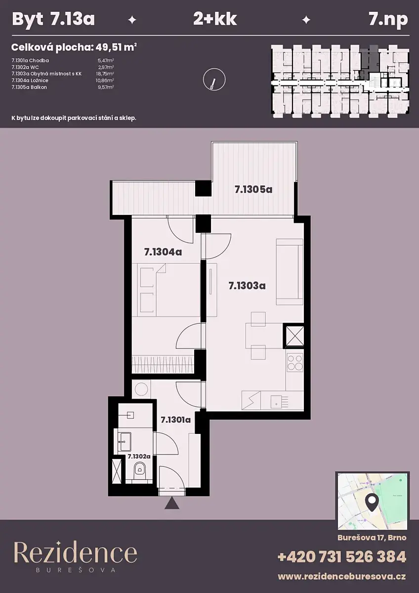 Nabízíme k prodeji moderní byt 2+kk o podlahové ploše 39,94 m2 s balkonem 9,57 m2 nacházející se v námi připravovaném projektu Rezidence Burešova v atraktivní lokalitě Veveří. Byt se nachází v 7.NP, orientace bytu do vnitrobloku, jižní strana. K bytu lze koupit parkovací místo v zakladači i sklad.
