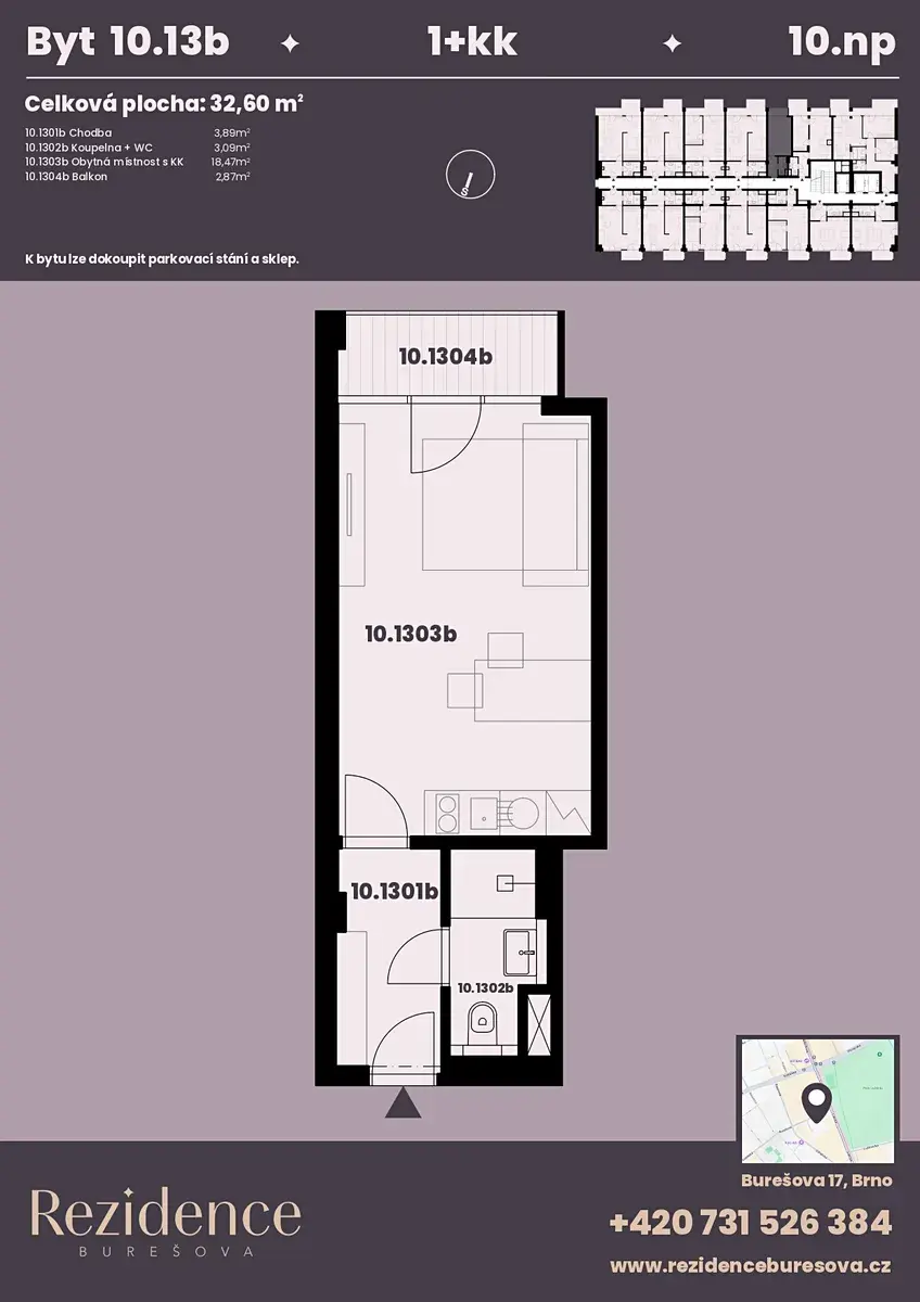 Nabízíme k prodeji moderní byt 1+kk o podlahové ploše 26,14 m2 s balkonem 2,87 m2 nacházející se v námi připravovaném projektu Rezidence Burešova v atraktivní lokalitě Veveří. Byt se nachází v 10.NP, orientace bytu do vnitrobloku, jižní strana s výhledem na Petrov a Špilberk. K bytu lze koupit parkovací místo v zakladači i sklep.