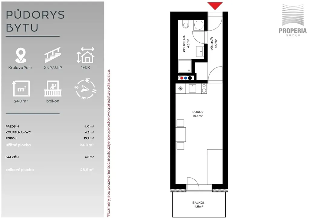Dispozice zahrnuje předsíň, koupelnu se sprchovým koutem a toaletou a hlavní obytný prostor s kuchyňským koutem. K bytu náleží i balkon o rozloze 4,6 m². Díky promyšlenému uspořádání nabízí byt dostatek prostoru pro pohodlné bydlení.