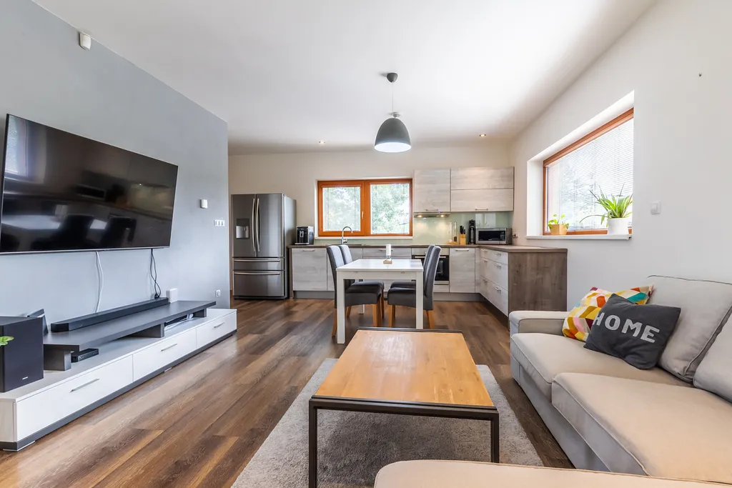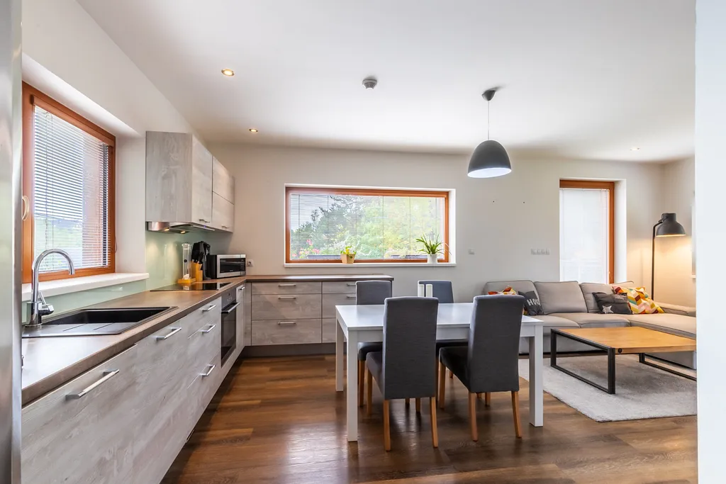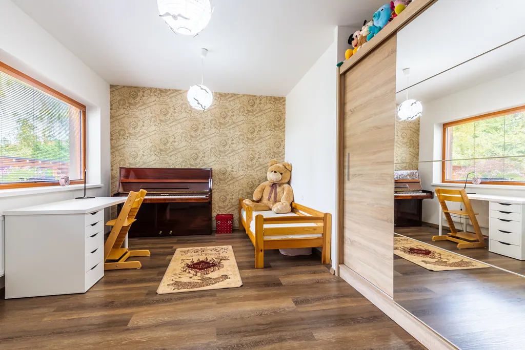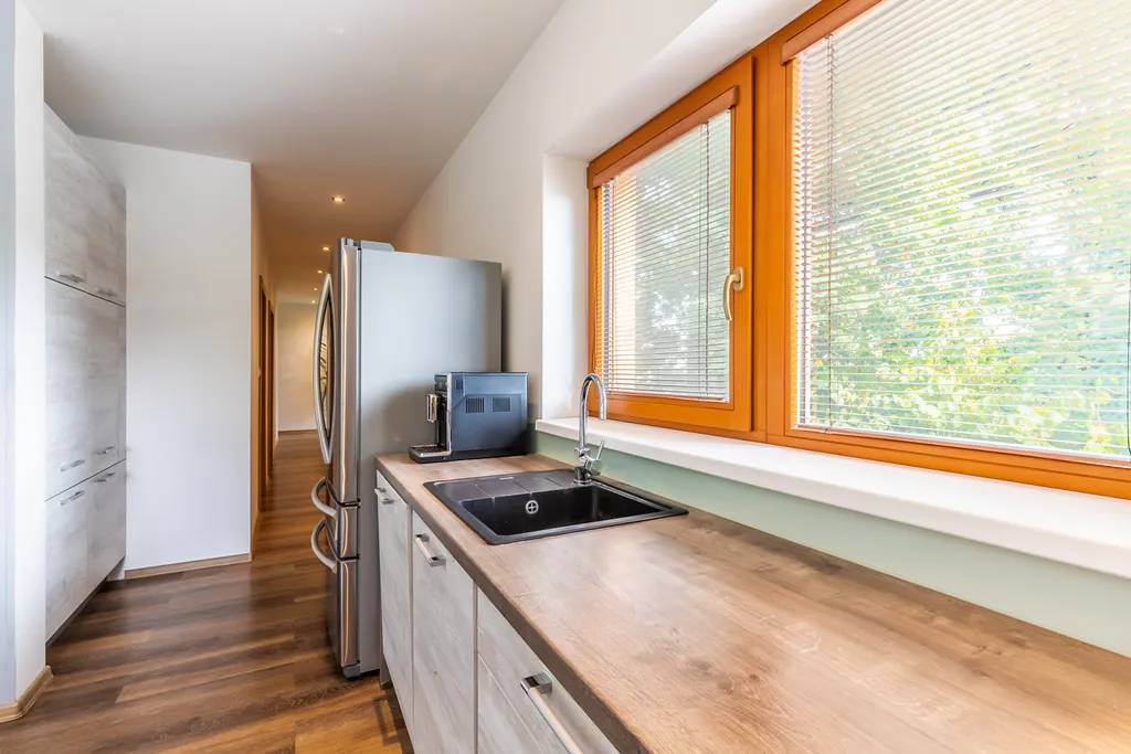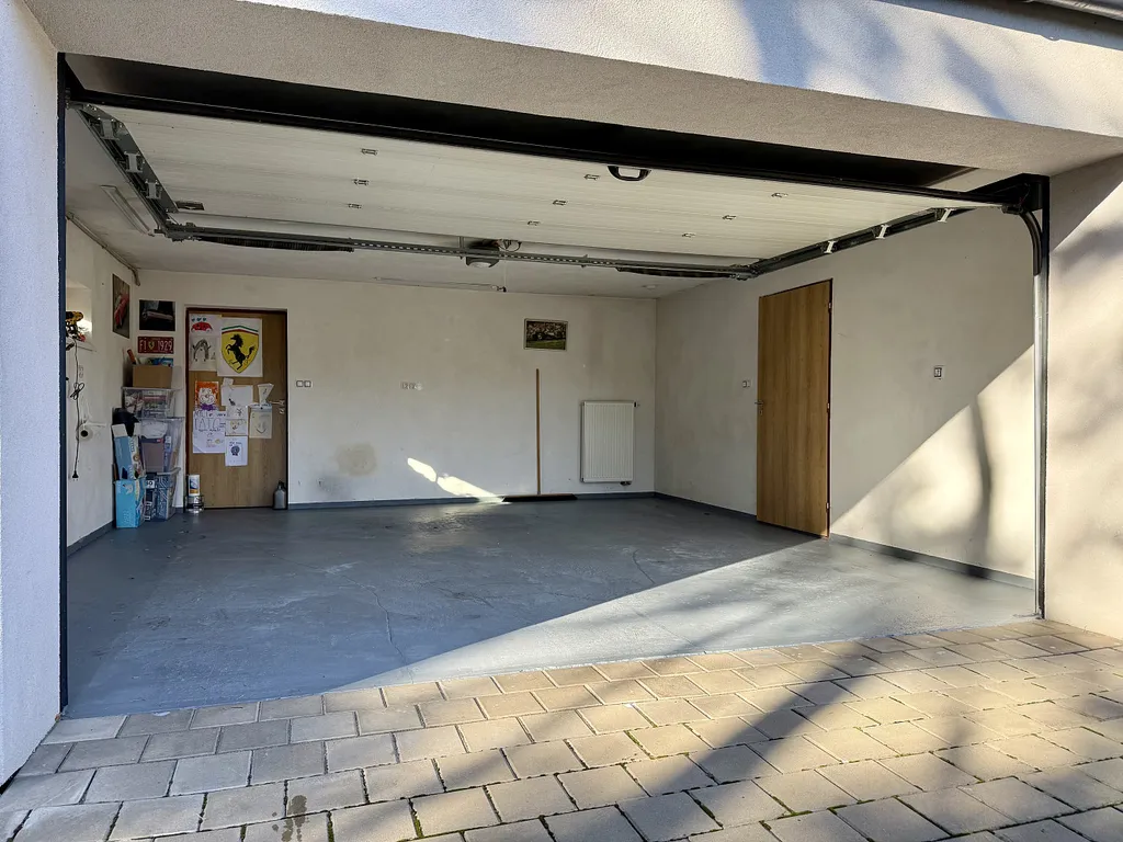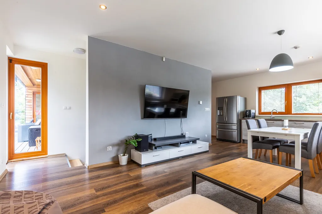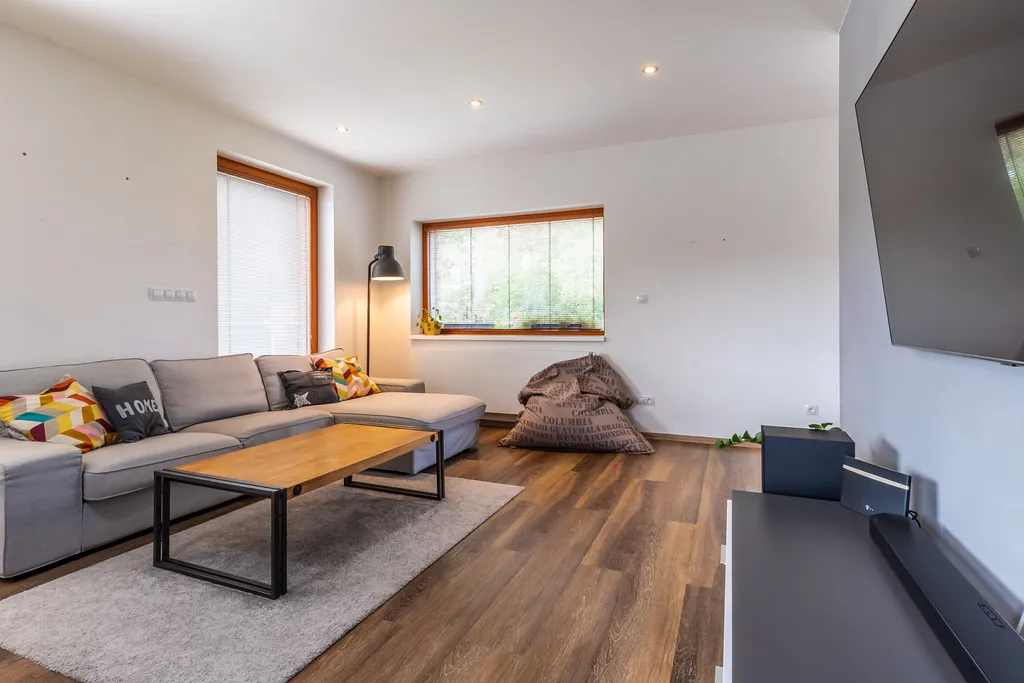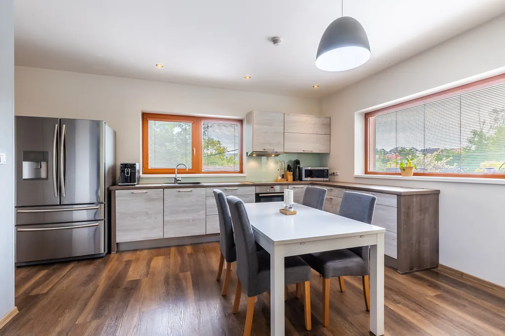 Dispozice domu - 1.PP - hlavní vstup/zádveří, hala se schodištěm, technická místnost, sklad a prostorná garáž. 1.NP - obývací pokoj ze kterého je francouzskými okny zpřístupněna pobytová terasa (31m²) a následně vstup do zahrady. Dále je zde kuchyňský kout s jídelnou, rodičovská ložnice s koupelnou s vanou, umyvadlem a WC. Dále se zde nachází dva dětské pokoje a druhá koupelna s WC. Z chodby je vstup do půdního prostoru (další úložný prostor). Dům byl kolaudován v roce 2015 a je ve velmi dobrém technickém stavu. K domu patří krásná a udržovaná zahrada se vzrostlými stromy, s altánem a bazénem. Dům je napojen na vlastní čistírnu odpadních vod, obecní vodovod, má však i vlastní studnu. Obecní kanalizace na hranici pozemku. Vytápění domu je řešeno plynovým kotlem.