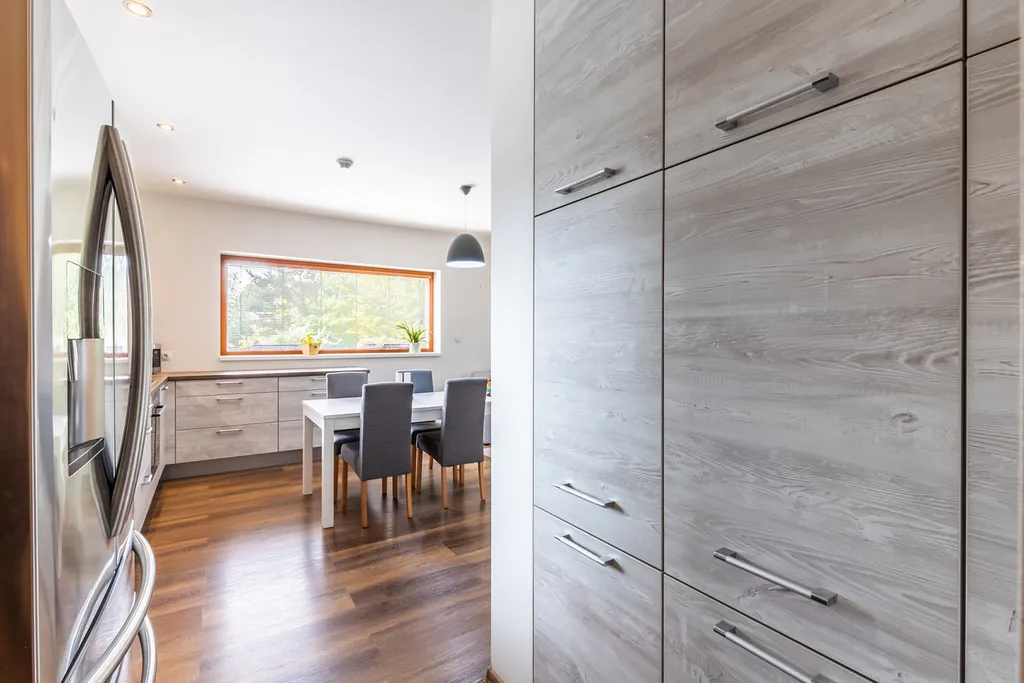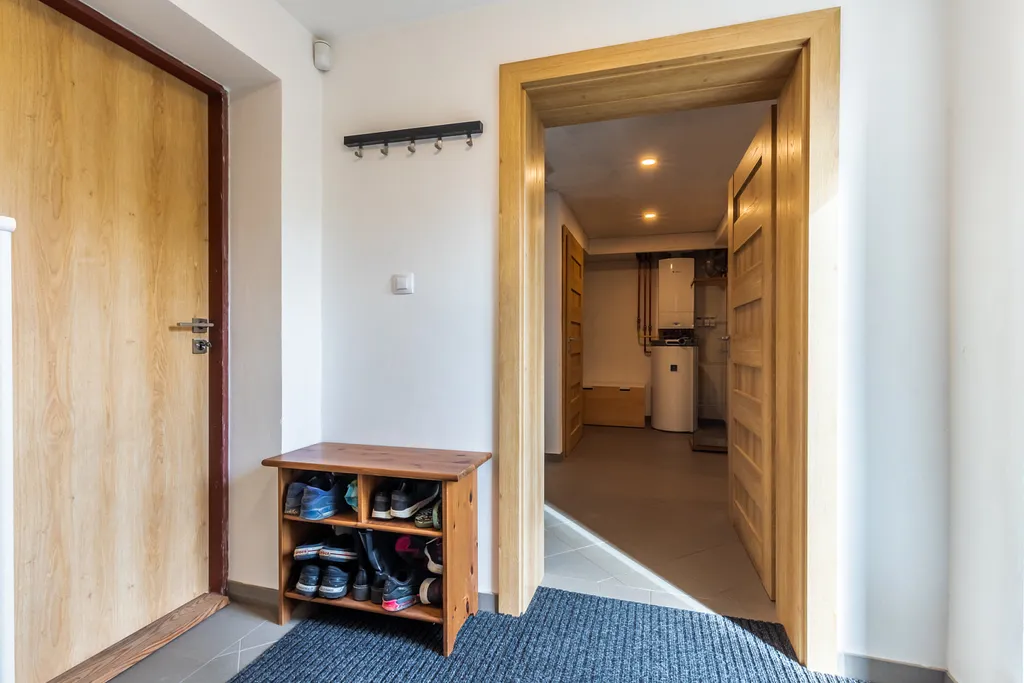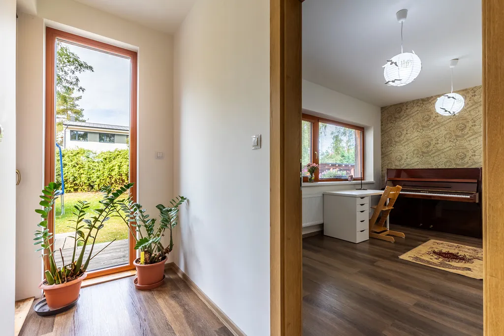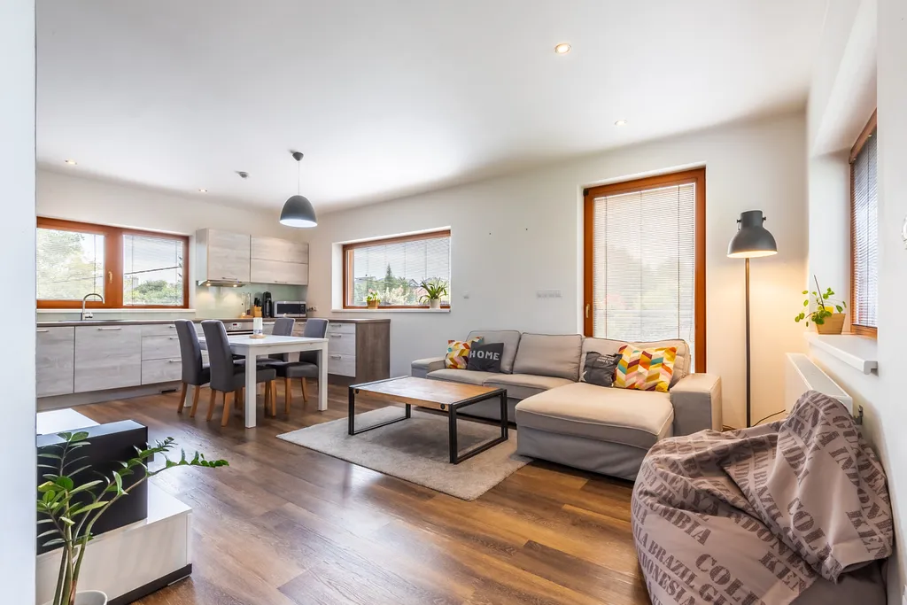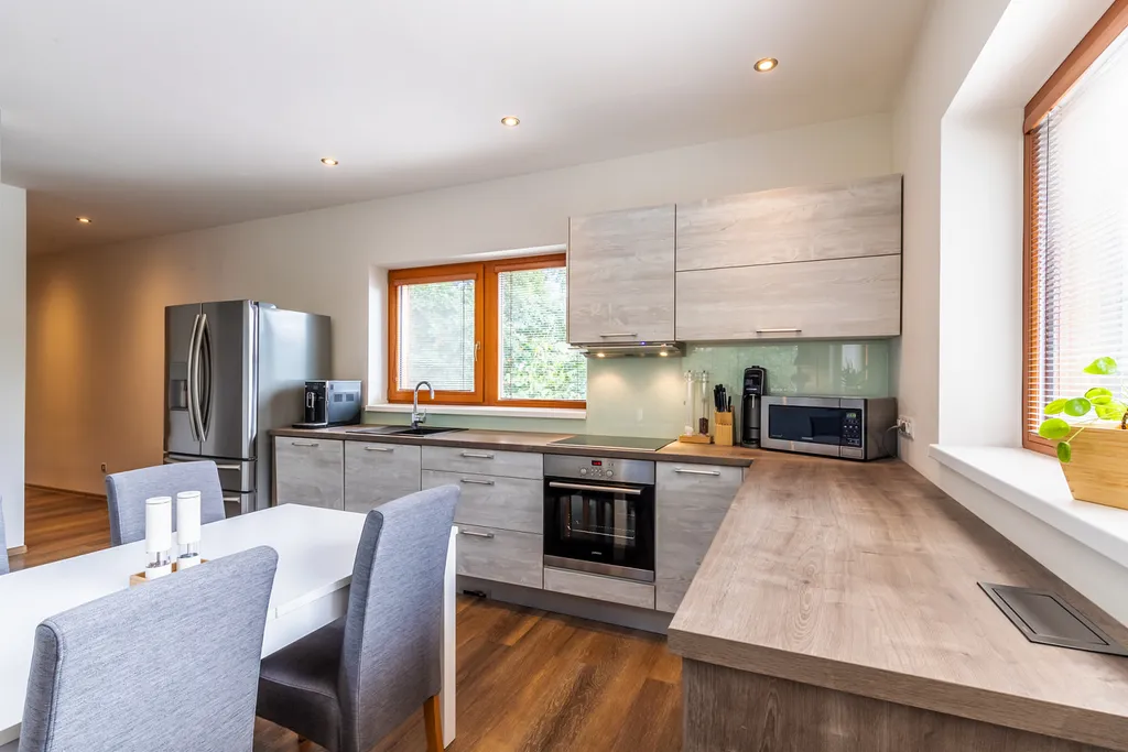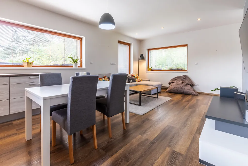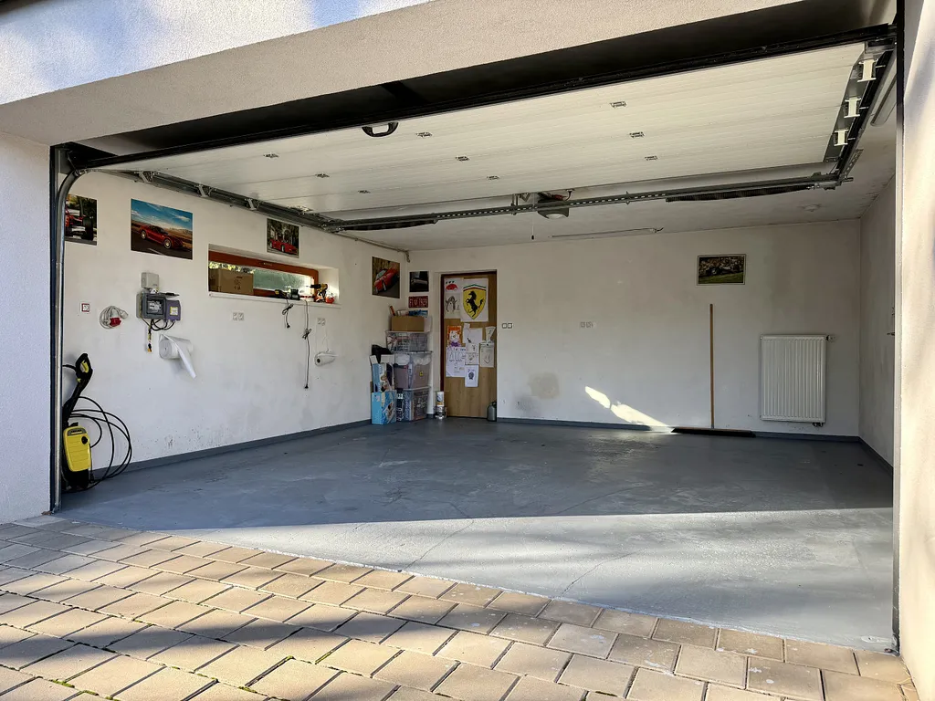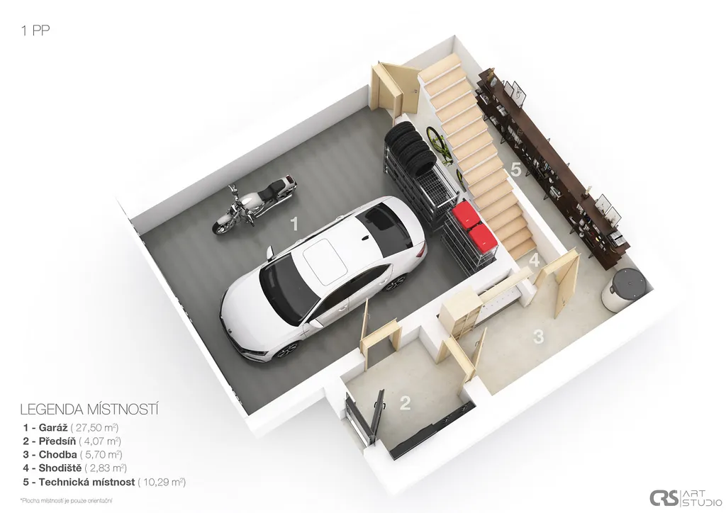 Dispozice domu - 1.PP - hlavní vstup/zádveří, hala se schodištěm, technická místnost, sklad a prostorná garáž. 1.NP - obývací pokoj ze kterého je francouzskými okny zpřístupněna pobytová terasa (31m²) a následně vstup do zahrady. Dále je zde kuchyňský kout s jídelnou, rodičovská ložnice s koupelnou s vanou, umyvadlem a WC. Dále se zde nachází dva dětské pokoje a druhá koupelna s WC. Z chodby je vstup do půdního prostoru (další úložný prostor). Dům byl kolaudován v roce 2015 a je ve velmi dobrém technickém stavu. K domu patří krásná a udržovaná zahrada se vzrostlými stromy, s altánem a bazénem. Dům je napojen na vlastní čistírnu odpadních vod, obecní vodovod, má však i vlastní studnu. Obecní kanalizace na hranici pozemku. Vytápění domu je řešeno plynovým kotlem.