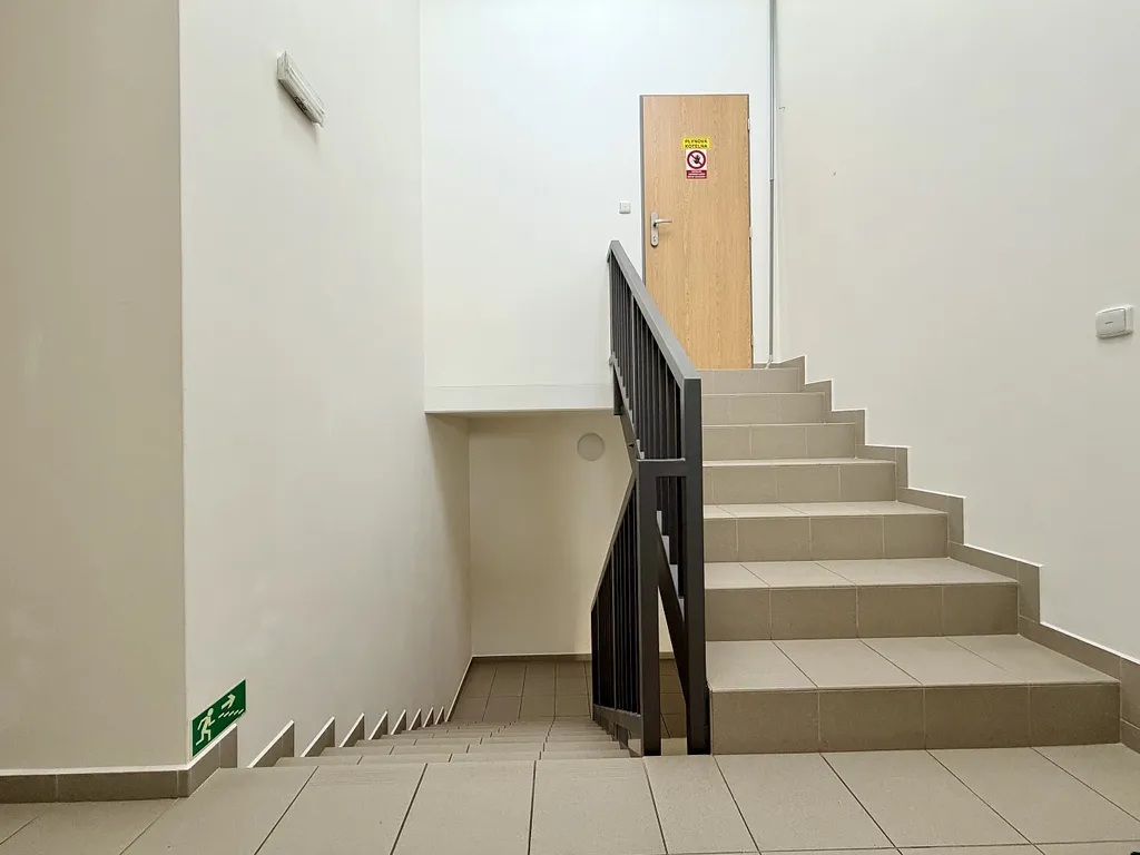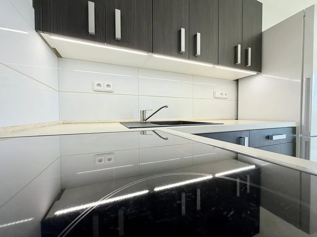 Dispozici tvoří vstupní chodba s vestavnou skříní na míru a velkým zrcadlem. Hlavní obytný prostor o rozloze 20,6 m² propojuje kuchyň, obývací část i ložnici do harmonického celku. Kuchyňská linka je vybavena vestavnými spotřebiči značky BOSCH – sklokeramickou varnou deskou, troubou, digestoří, dřezem a lednicí s mrazákem. Z obytné části přes francouzské dveře vstupujeme na balkon o velikosti přibližně 2 m², který poskytuje soukromí a prostor k relaxaci.