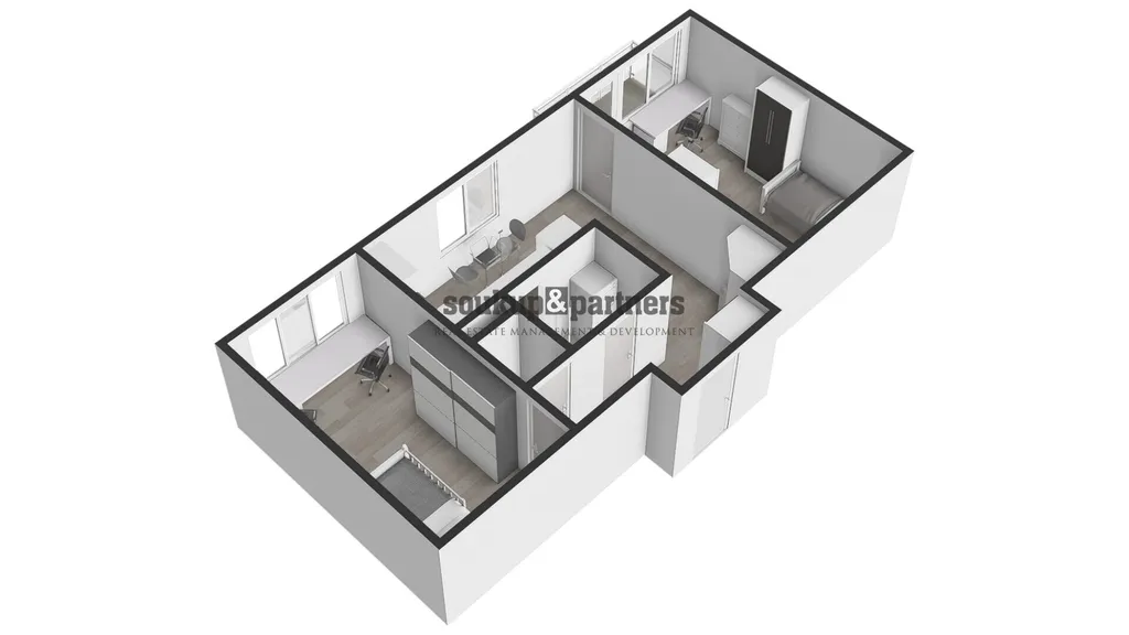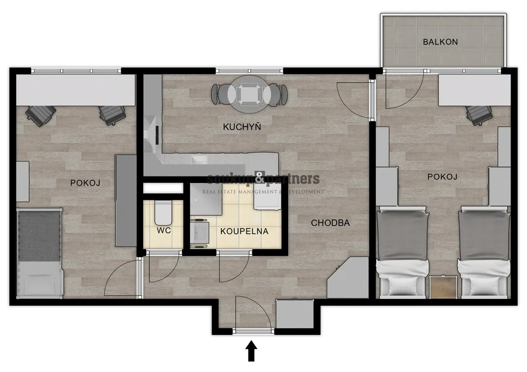 Byt má ideální rozložení se dvěma neprůchozími pokoji a samostatnou kuchyní.