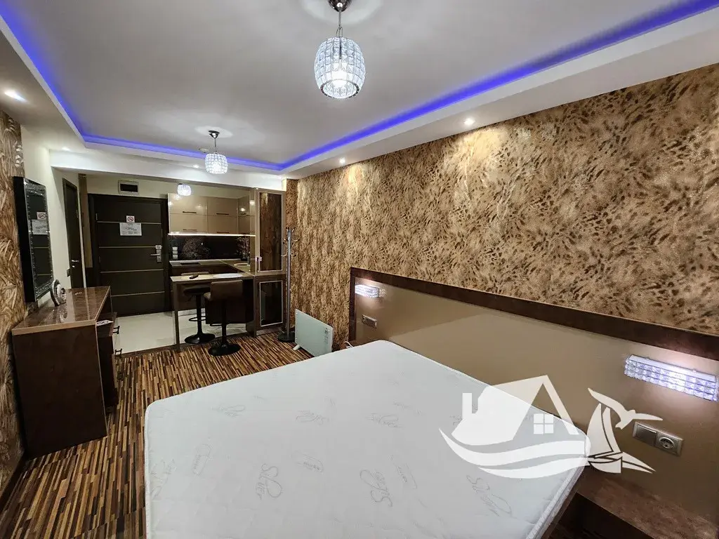 Byt je umístěn v přízemí a tvoří jej jedna prostorná místnost, která byla navržena s důrazem na kvalitu a estetiku. Kuchyňský kout je vyroben na míru a doplněn originálním skleněným obkladem s motivem, který prostoru dodává charakter. Barový pult slouží nejen k posezení, ale i jako přirozené propojení obytné a kuchyňské části. Dominantou místnosti je pohodlné manželské lůžko, orientované směrem k televizní stěně.