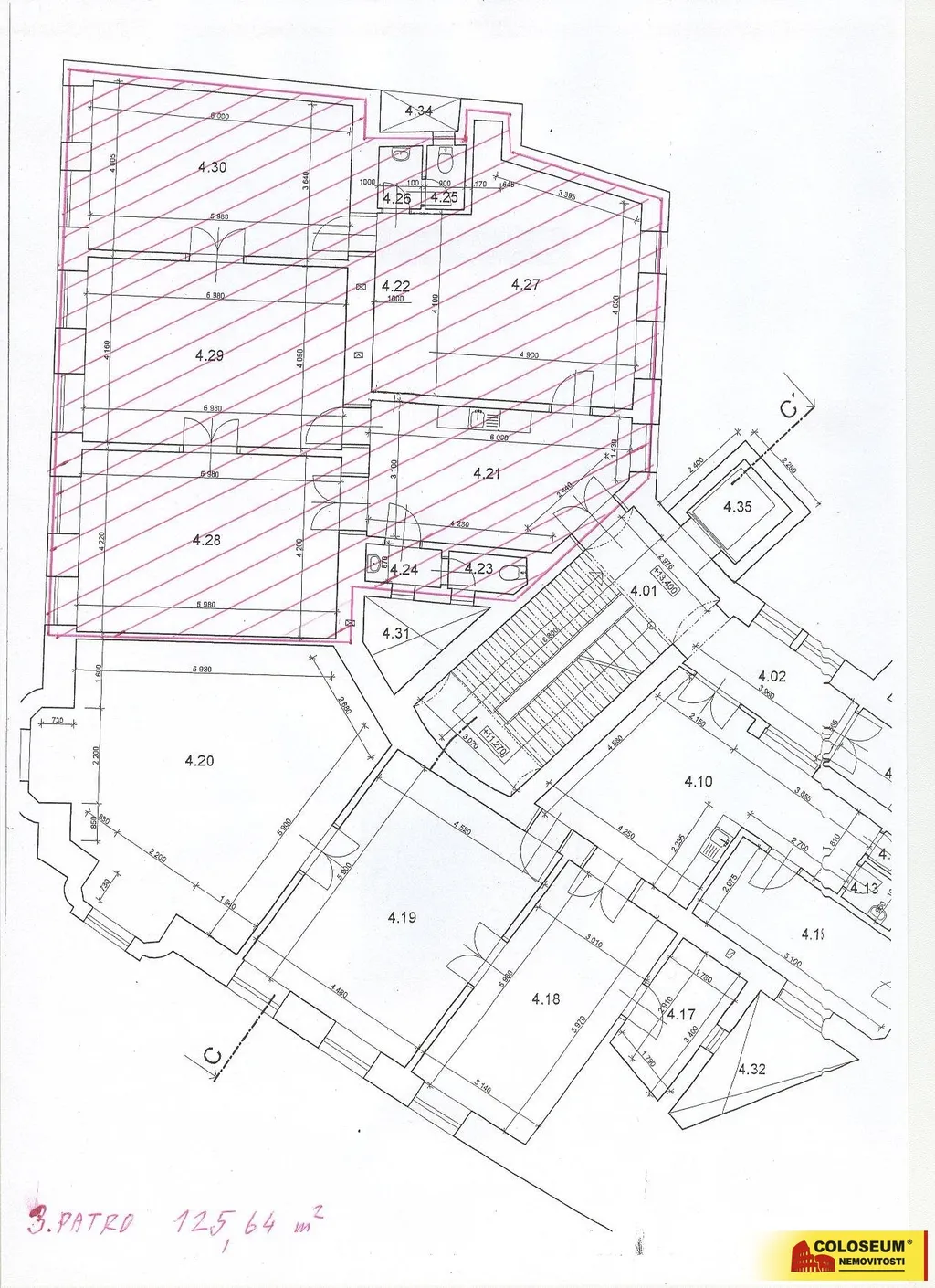 Okna jsou ve většině místností do ulice Masarykova, a dále i do dvora. Tato kancelářská jednotka má stejně jako i ty ostatní v domě svůj vlastní elektrokotel k vytápění a elektrické ohřívače vody (sazba el. energie 20 hodin NN + 4 hodiny VN) a svůj vlastní podružný elektroměr a podružný vodoměr měřící spotřebu el. energie a vodného a stočného na každou tuto jednu kancelářskou jednotku. Takže takto jsou měřeny veškeré energie včetně vytápění, které nájemce opravdu ve skutečnosti spotřebuje.