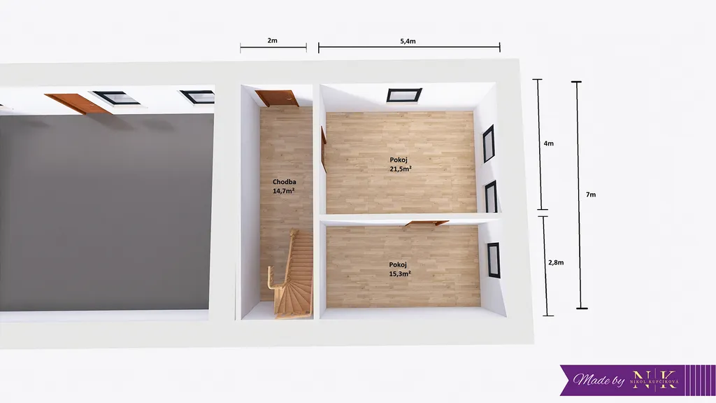 Nad částí s pokoji, dílnou a konírnou se nachází velký půdní prostor, ze kterého se dají vybudovat další místnosti.