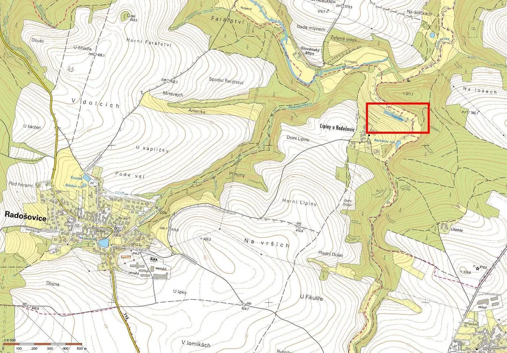 Nabízíme k prodeji pozemek v katastru vedený jako zahrada o výměře 2230 m2 v katastrálním území Radošovice u Vlašimi (část Lipiny u Radošovic, okres Benešov, Středočeský kraj). Pozemek se nachází v blízkosti Lipinského potoka a je aktuálně obhospodařován na základě pachtovní smlouvy s roční výpovědní lhůtou. Přístup je zajištěn obecní cestou. Podle platného územního plánu je zařazen jako plocha zemědělská - trvalý travní porost.