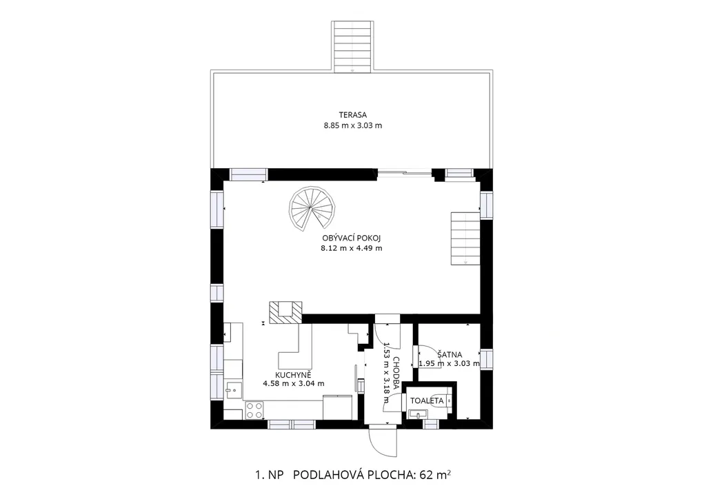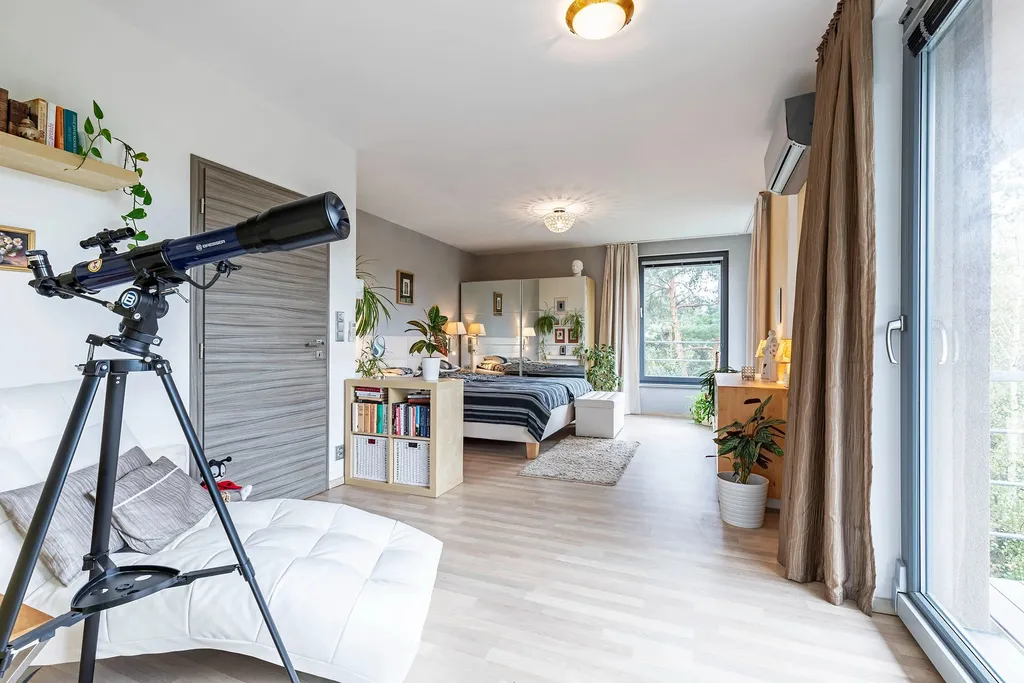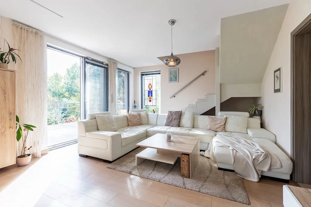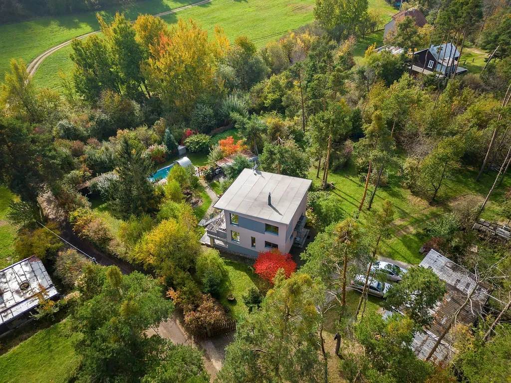 V přízemí naleznete obývací pokoj s kuchyní a vchodem na úžasnou terasu, z ní jste pak jednou nohou v bazénu. Šatna a WC přízemí doplňují. V patře na Vás čeká koupelna s originálním oknem do zeleně a rohovou vanou, opět oddělenou toaletou a dominantní ložnicí se vstupem na balkon a opět s dostatkem světla, jakožto v celém domě.