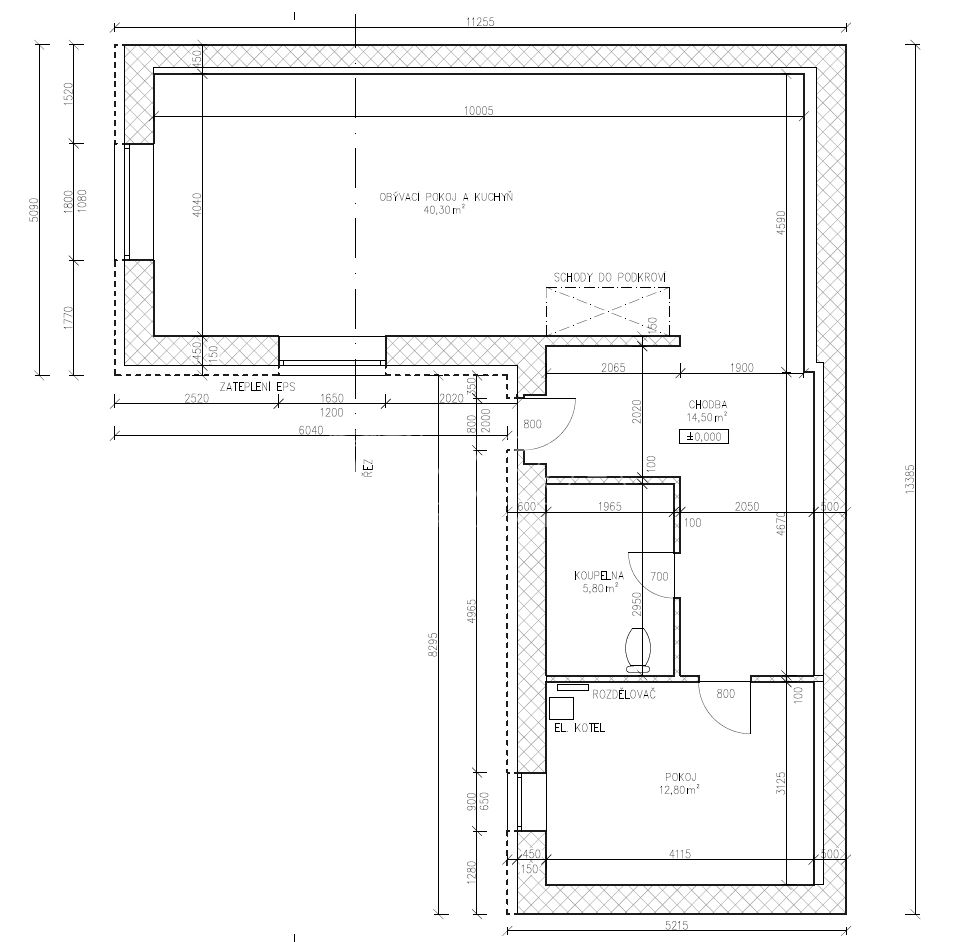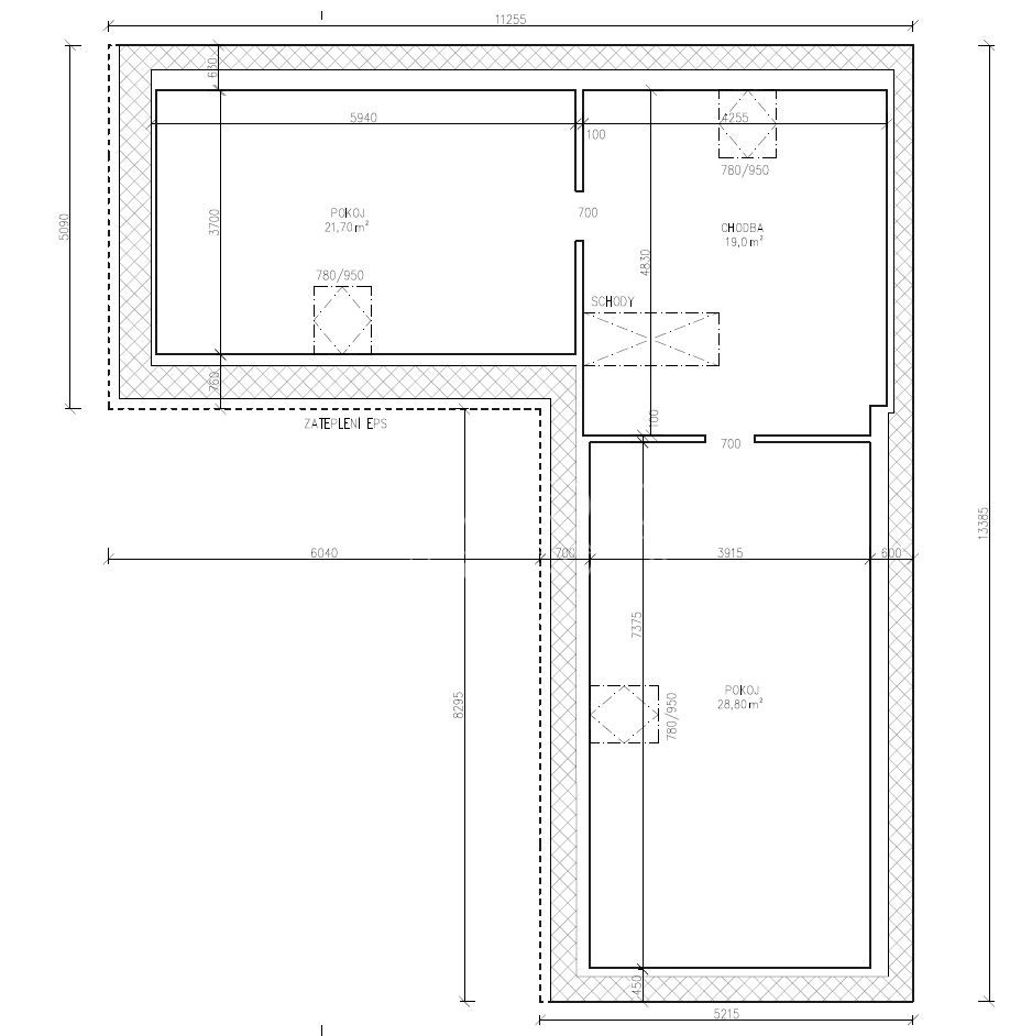 • Strop – trámy 20 cm, vata 10 cm + sádrokarton. Z vrchu OSB deska 2,5 cm + vinylová podlaha.