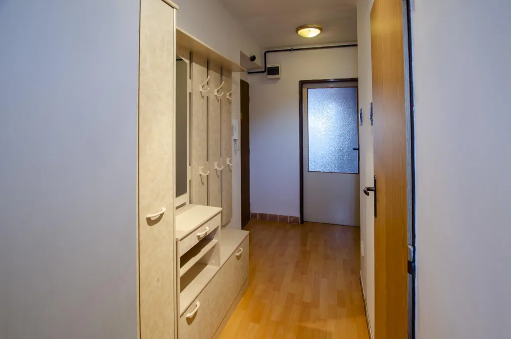 Vybavení bytu: manželská postel, prostorná šatní skříň, sedací souprava v obývací části, obývací stěna, stůl + židle. Kuchyňská linka je vybavena troubou, plynovou varnou deskou, mikrovlnnou troubou a myčkou na nádobí. V koupelně je sprchový kout a pračka. Úložné prostory na chodbě. Toaleta je oddělena, s oknem do vnitrobloku.
