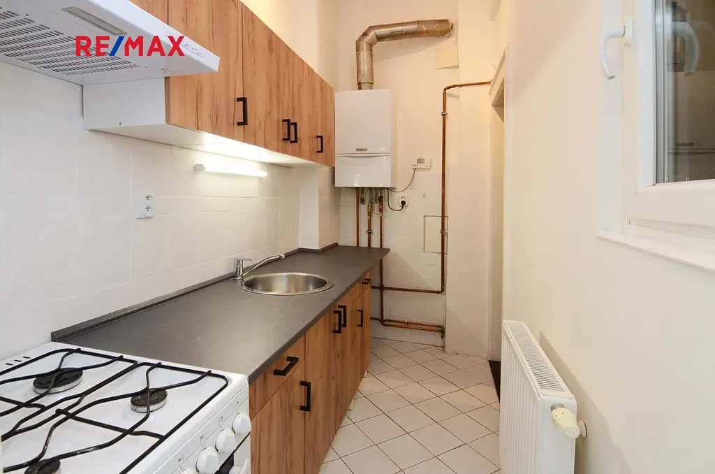 V bytě je dále kuchyně s novou linkou, sporákem s troubou, součástí je též lednice umístěná v komoře.