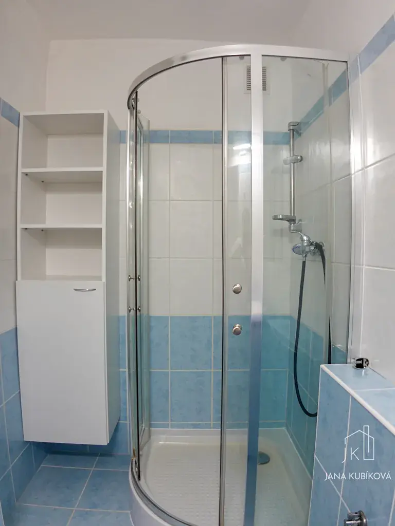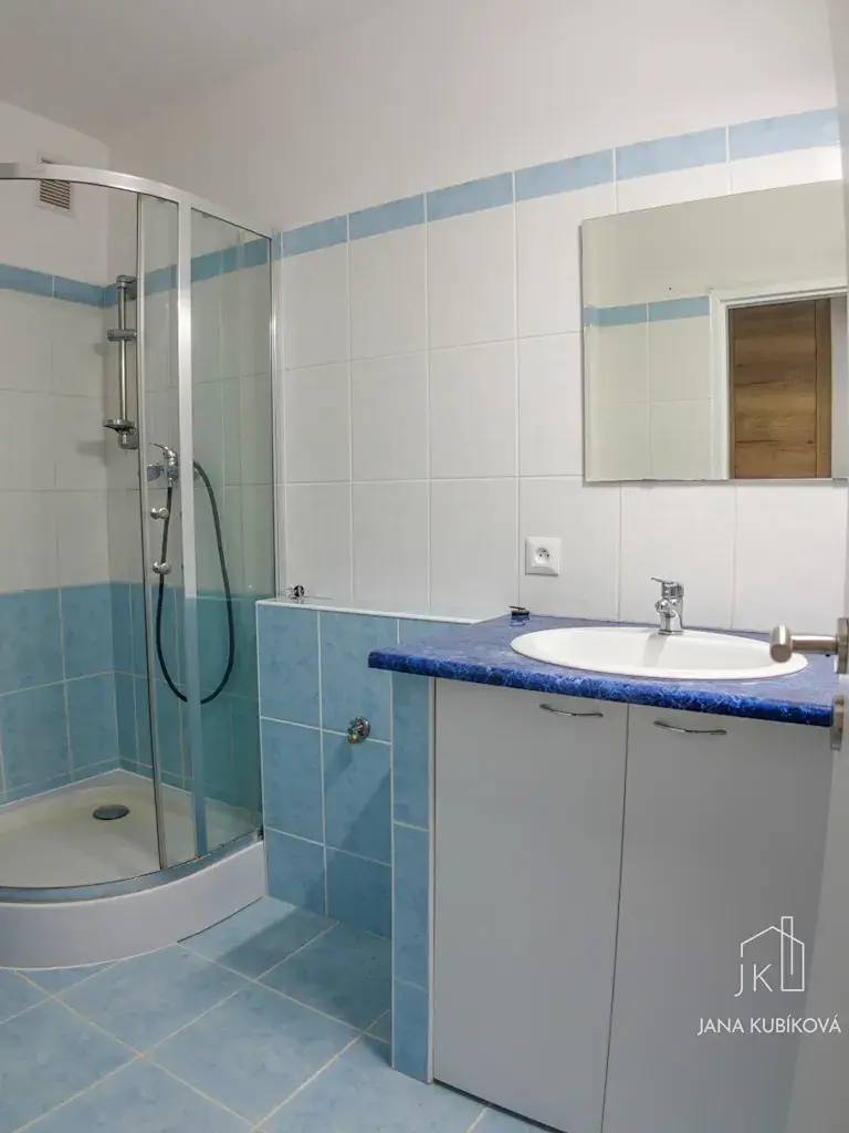 Koupelna – sprchový kout, umyvadlo se skříňkami, připojení na pračku