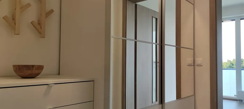 Byt tvoří vstupní hala s vestavěnou šatní skříní, komodou a věšákem, obývací pokoj s plně vybavenou kuchyní (myčka, lednice, indukční varná deska, digestoř) a přístupem do prostorné lodžie, koupelna (sprchový kout, pračka se sušičkou) s toaletou. Velkoformátové francouzské okno zajišťuje dostatek světla, předokenní žaluzie jsou k dispozici.