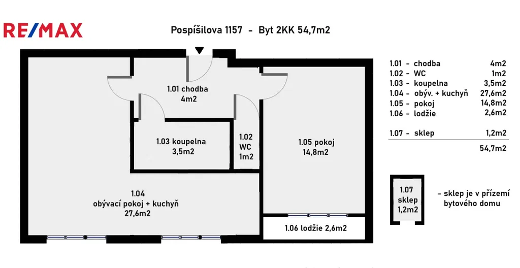 • pokoj s lodžií: 14,8 m² + lodžie 2,6 m²