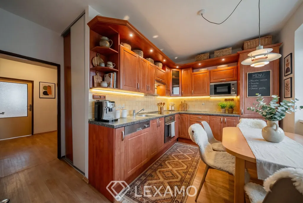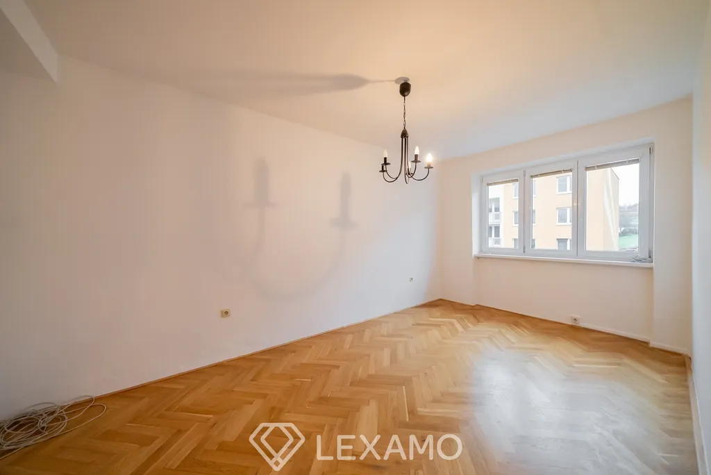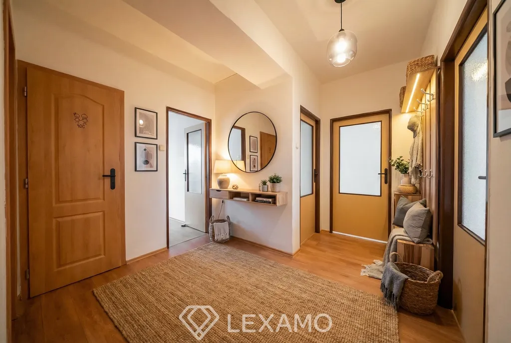 Jednotka je umístěna ve 2. nadzemním podlaží cihlového bytového domu a nabízí celkovou plochu 92 m², včetně balkonu a tří sklepů. Dispozičně je velmi dobře řešena – dvě ložnice, obývací pokoj se vstupem na balkon o velikosti 2 m², samostatná kuchyně, koupelna, toaleta a prostorná vstupní chodba. V obytných místnostech jsou parkety, okna jsou plastová.