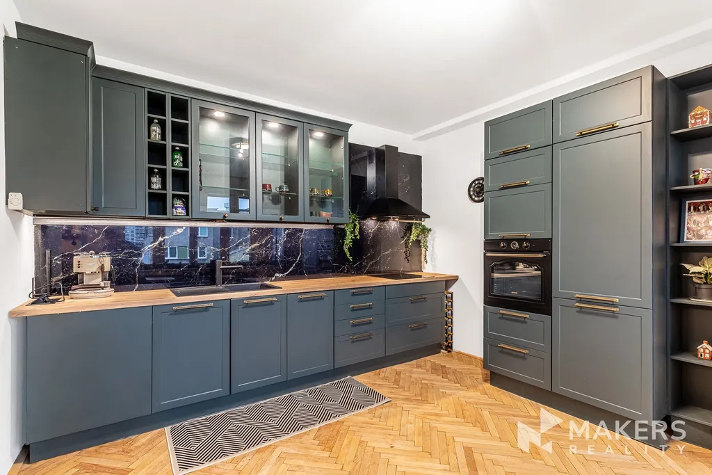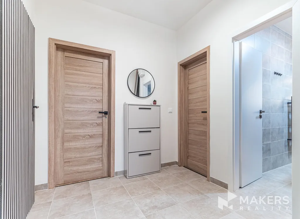 Srdcem bytu je otevřený obývací prostor s kuchyní, který působí vzdušně, klidně a přirozeně; kuchyňská linka značky Gorenje je plně vybavená a plynule navazuje na praktický barový pult, jenž nabízí místo jak pro ranní kávu, tak pro večerní posezení s přáteli či práci z domova. Celý obytný prostor sjednocuje elegantní dřevěná podlaha ve vzoru rybí kost, která interiéru dodává teplo, nadčasový charakter a pocit domova, a z obývací části je vstup na balkon, jenž příjemně rozšiřuje obytnou zónu a poskytuje prostor k odpočinku.​
