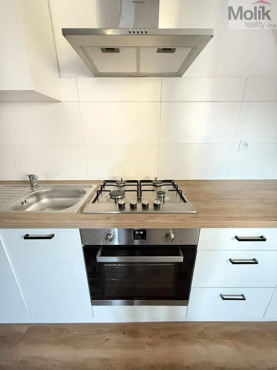 - Kuchyňská linka s vestavěnými spotřebiči (elektrická trouba, plynová varná deska, komínový odsavač par)