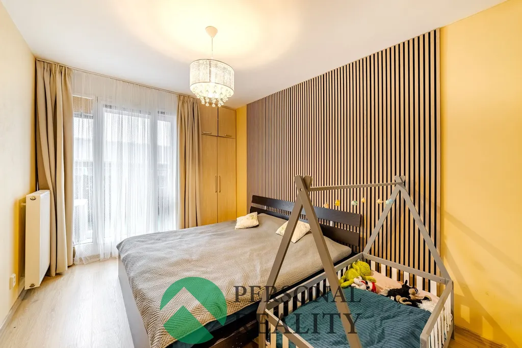 Dispozice bytu: Byt se nachází v 2.patře domu. V domě je výtah a parkovací stání. K bytu náleží parkování před domem. Součástí bytu je kuchyň a prostorný obývací pokoj, ložnice s balkónem, WC, koupelna, prostorná šatna na uložení věcí a chodba. Je zde nainstalována klimatizace. Dům byl postaven v roce 2013. V bytě je nová elektřina.