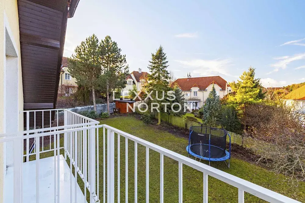 Tento světlý nezařízený rodinný dům k pronájmu nabízí v přízemí k užívání vstupní halu, kuchyň, jídelnu, prostorný obývací pokoj se vstupem na terasu a udržovanou zahradu, pracovnu, pokoj pro hosty, koupelnu a samostatnou toaletu. V patře se nachází 5 ložnic, z čehož 3 ložnice se vstupem na balkon, koupelna, komora a samostatná toaleta. Součástí domu je garáž pro dva automobily, další parkování na pozemku a privátní příjezdová cesta zajišťující maximální komfort a soukromí.