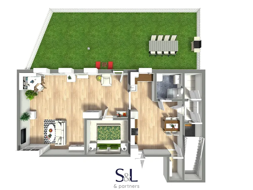 Byt, který voní novotou, ale přitom působí jako útulný domek. Má svůj vlastní kousek zeleně, kam se můžete schovat před světem, uspořádat letní grilování nebo postavit bazén pro radost vašich nejbližších.