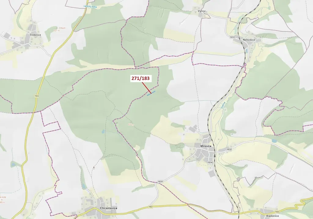Lesní pozemek o výměře 2 398 m2, parcelní číslo 271/183, podíl 1/1, katastrální území Milavče, obec Milavče, obec s rozšířenou působností Domažlice, okres Domažlice, Plzeňský kraj. Po těžbě.