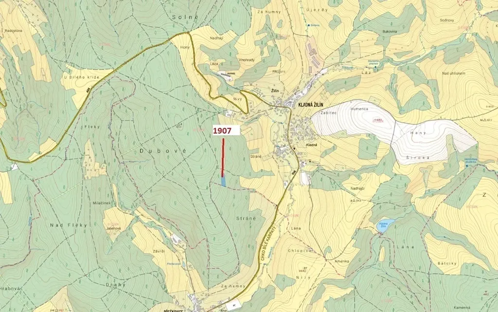 Lesní pozemek o výměře 3147 m2, parcelní číslo 1907, podíl 1/1, katastrální území Kladná Žilín, obec Luhačovice, obec s rozšířenou působností Luhačovice, okres Zlín, Zlínský kraj. Po těžbě.