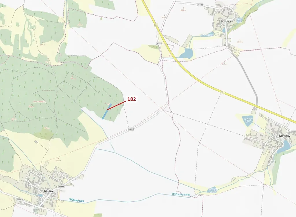 Lesní pozemek o výměře 2665 m2, parcelní číslo 182, podíl 1/1, katastrální území Klučov, obec Klučov, obec s rozšířenou působností Třebíč, okres Třebíč, Kraj Vysočina. Po těžbě.