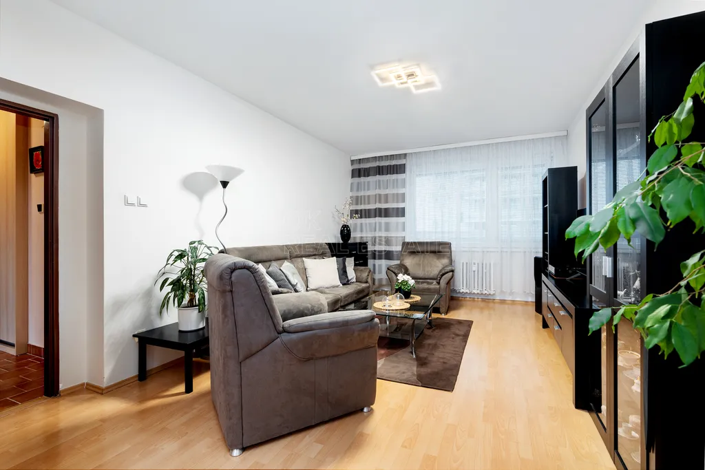 Dispozice bytu je dobře řešená: ze vstupní předsíně je přístup do hlavních částí bytu. Obývací pokoj tvoří přirozené centrum domácnosti a plynule navazuje na jídelní kout a samostatnou kuchyň, která je osvětlena okny směrem do první zasklené lodžie.