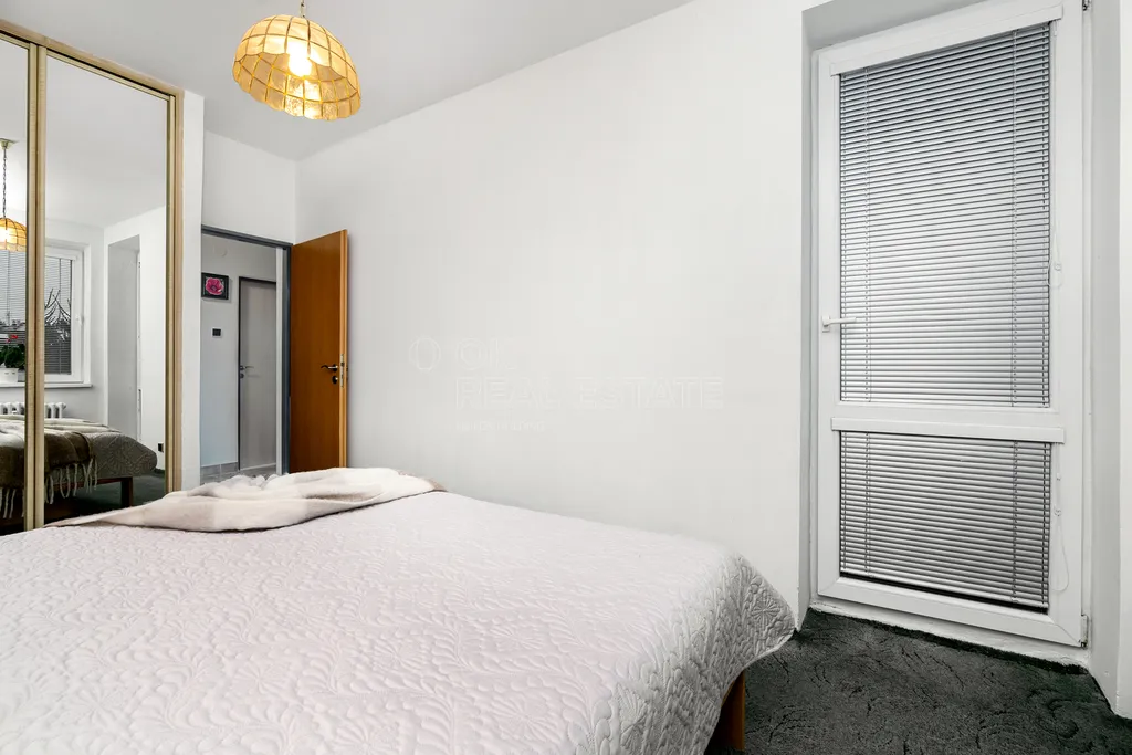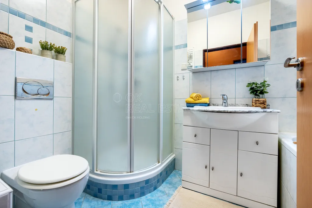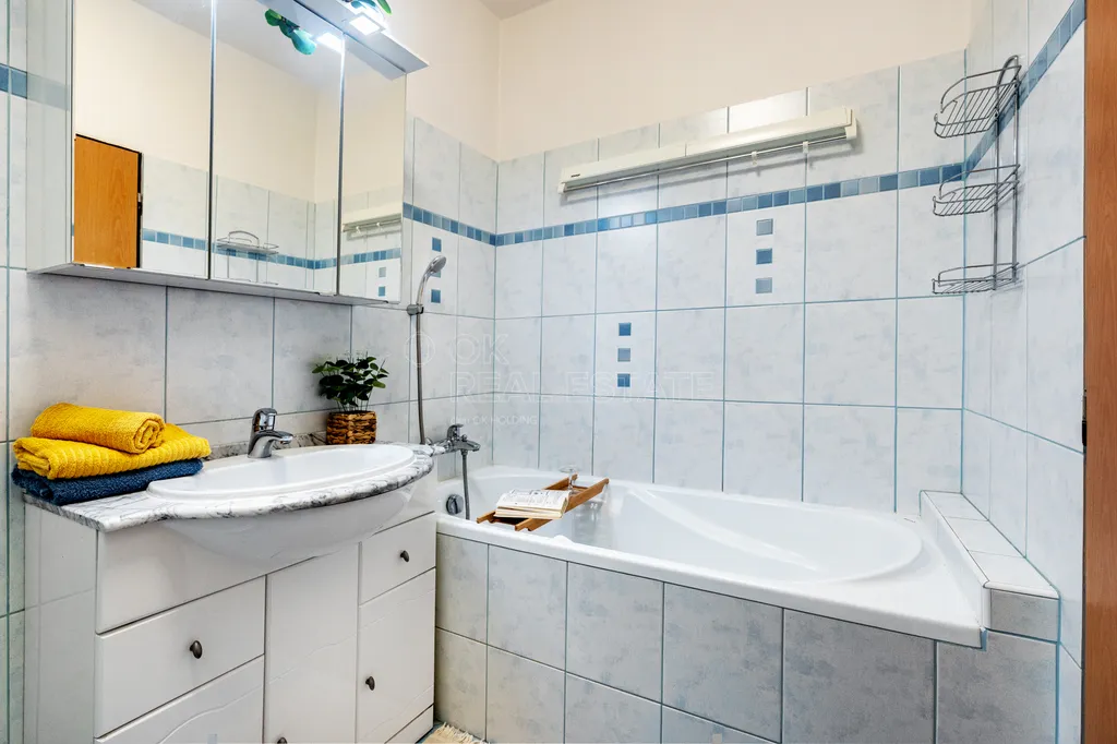 V levé části předsíně se nacházejí dva samostatné pokoje, z nichž jeden má vstup na druhou zasklenou lodžii. Byt dále nabízí koupelnu s vanou, sprchovým koutem a toaletou, navíc je zde i samostatná toaleta situovaná u obytné části. Velkým praktickým benefitem je komora přímo v bytě.