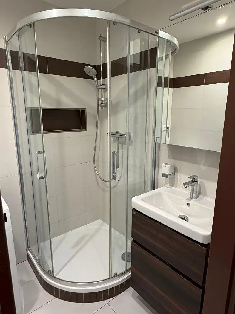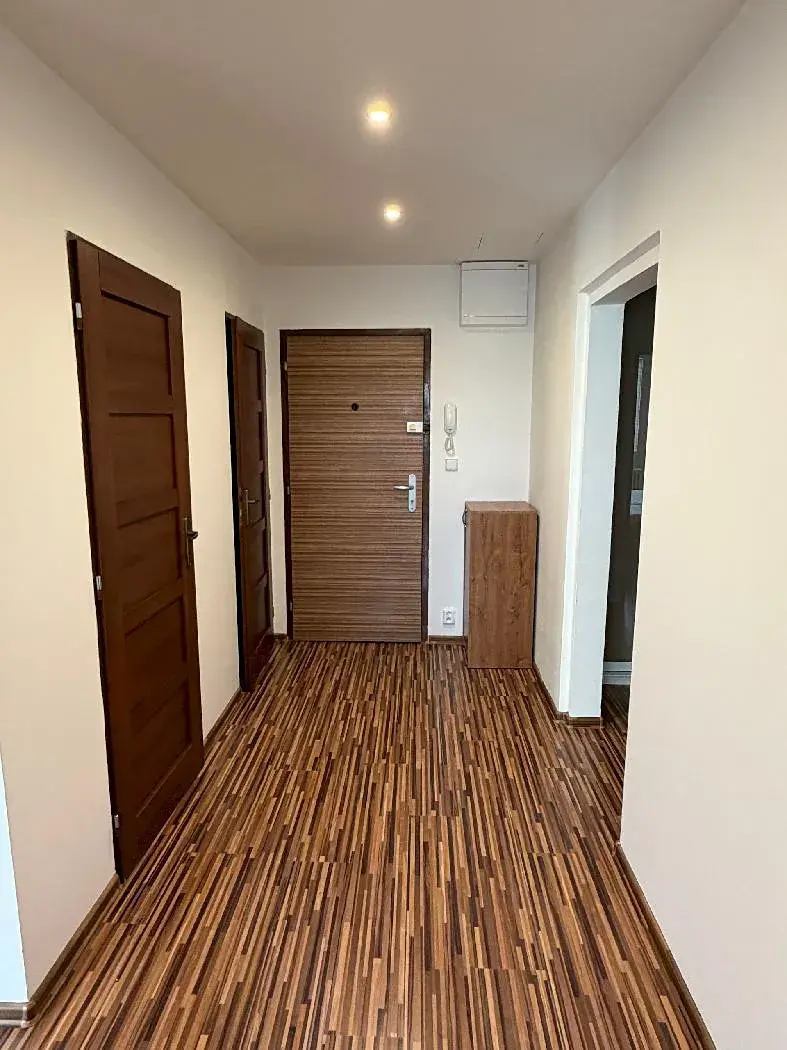 Byt má pěknou designovou koupelnu se sprchovým koutem, samostatné wc, šatna u ložnice, v předsíni jsou vestavěné skříně, na podlaze moderní plovoucí podlahy, byt je čerstvě vymalován. Pro budoucího nájemníka je k dispozici, kuch. linka se spotřebiči, nová myčka, plyn. varná deska, nová pračka atd.