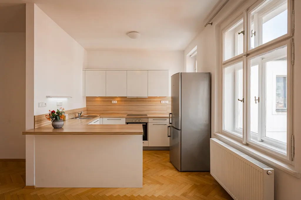 Nabízíme k pronájmu malebný byt 2+kk v 5. patře historického domu s výtahem přímo v centru města ve vyhledávané lokalitě Praha 1 - Staré Město. Nezařízený byt s celkovou plochou 73 m2 nabízí vstupní halu, prostorný obývací pokoj, kuchyň vybavenou všemi spotřebiči, 1 ložnici, koupelnu s vanou, umyvadlem a toaletou a samostatnou toaletu. K vybavení bytu patří dřevěné parkety, kvalitní dlažby, vysokorychlostní internet. Byt byl citlivě zrekonstruován se zachováním historických stavebních prvků. Atraktivní lokalita s veškerou občanskou vybaveností, restaurace, obchody, kavárny, bistra a nákupní centrum.v pěší vzdálenosti. Výborná dostupnost MHD, pouze pár minut od stanice metra Můstek. V blízkém okolí je množství historických památek, Staroměstské náměstí, Václavské náměstí.