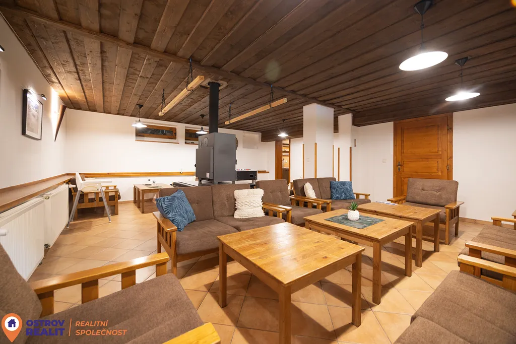 Velká společenská místnost s krbovými kamny, posezením a fotbálkem, TV s internetovým vysíláním, dětský koutek