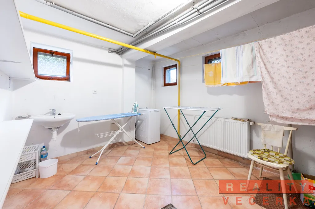Do suterénu lze vstoupit z přízemí domu nebo zvenčí přes garáž (26,3 m2), či samostatným vstupem ze zahrady. Mimo garáž jsou zde prostory na technické zázemí – plynový kotel na vytápění domu zn. Vailland, sušárna prádla, úložné místnosti. Garážová vrata jsou na dálkové ovládání