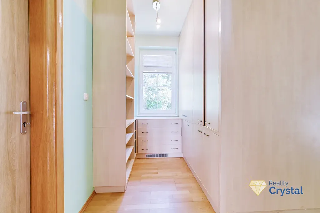 Dřevěným schodištěm se dostaneme do 1. patra a do dalších 4 pokojů a dvou koupelen. Podlahy v domě jsou plovoucí, dřevěné, v koupelná je dlažba.
