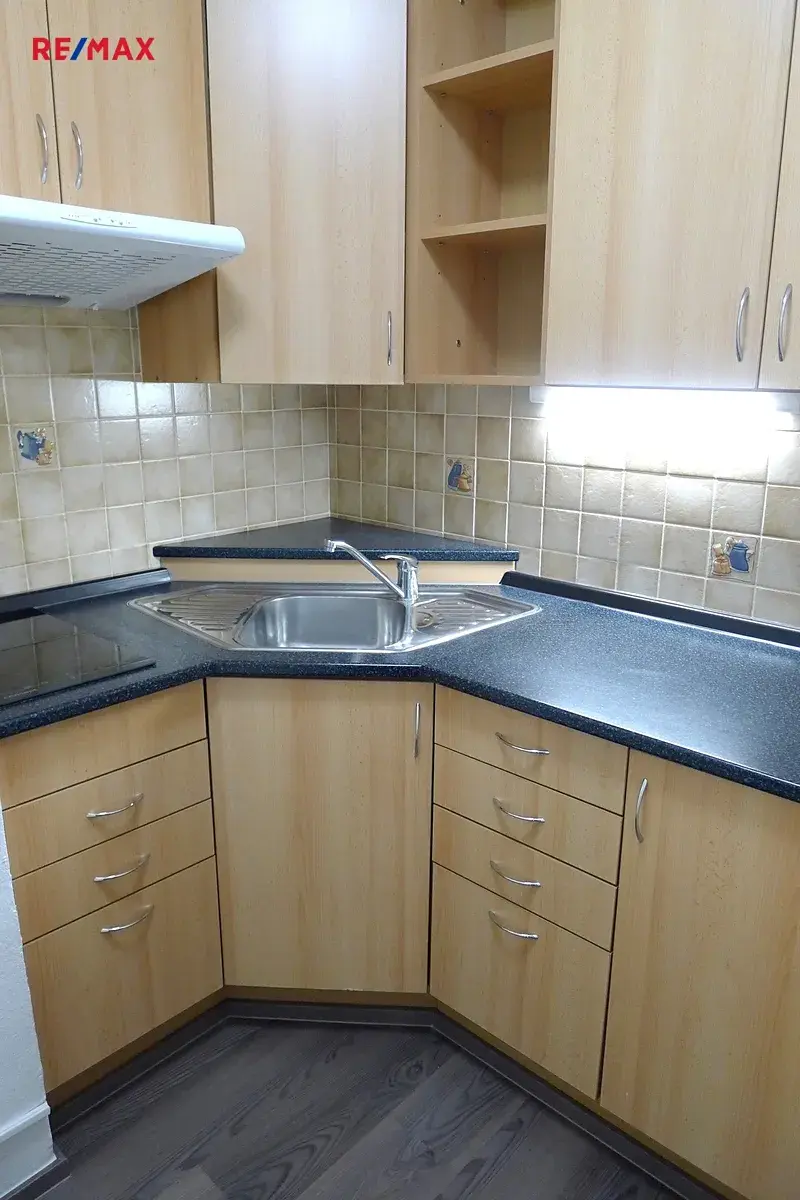 Kuchyňský kout je vybaven elektrickým dvouplotýnkovým vařičem, lednicí s mrazákem a mikrovlnnou troubou. V koupelně je vana, umyvadlo se skříňkou a pračka. Byt není dále vybaven. Na oknech jsou žaluzie. Ohřev vody a topení dálkově.