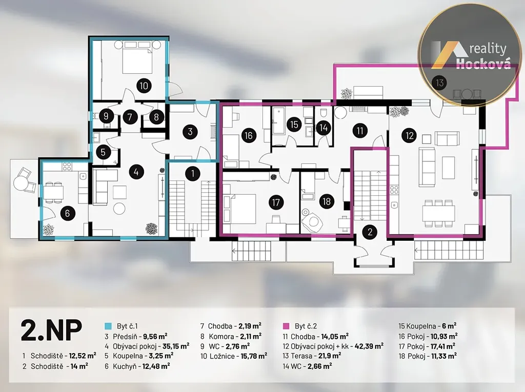 2. NP – prostorný byt (2+kk) + (4+kk) o celkové ploše 176m2 + balkony a také se vstupem na terasu a zahradu