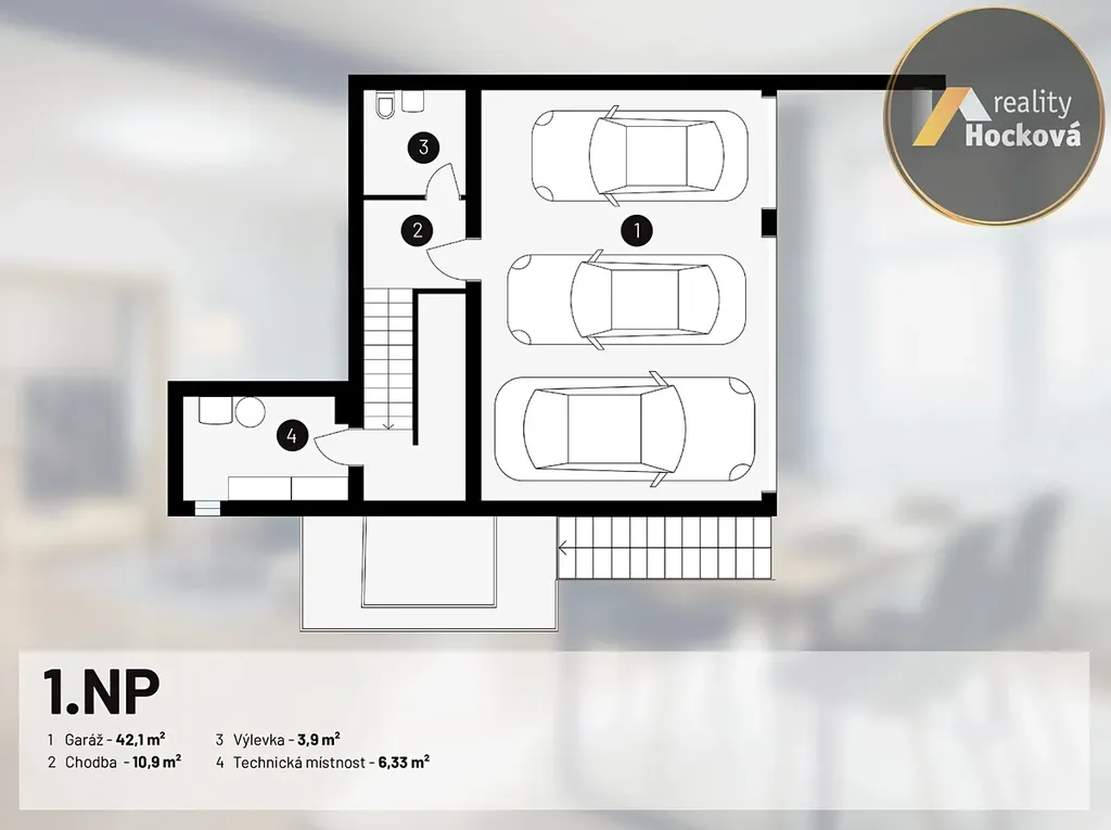 1. NP – prostorný byt (2+1) + (4+kk) o celkové ploše 188m2 + terasy se vstupem přímo do zahrady