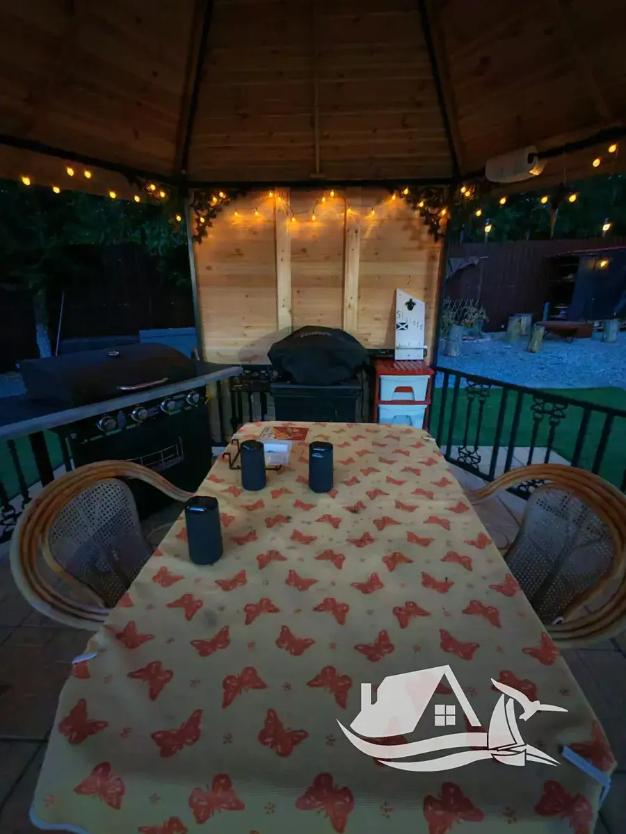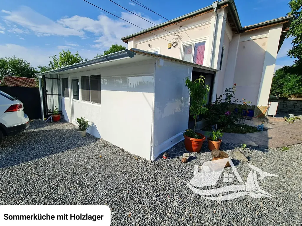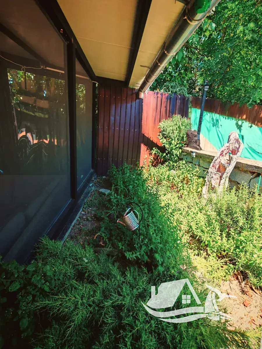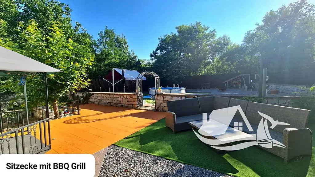 Za domem se nachází krytá terasa s posezením, grilem a čajovým koutkem, kde si můžete užívat klidné večery. Dvůr je krásně upravený, částečně vydlážděný kamenem a doplněný o zeleň, která nevyžaduje složitou údržbu.