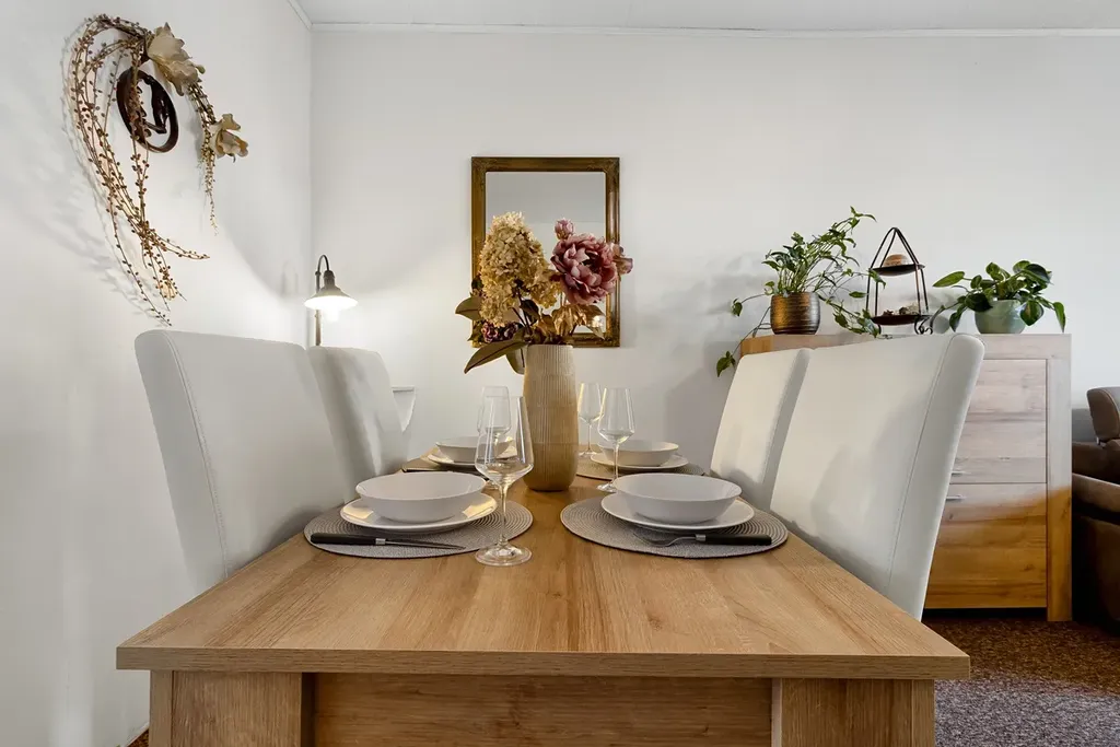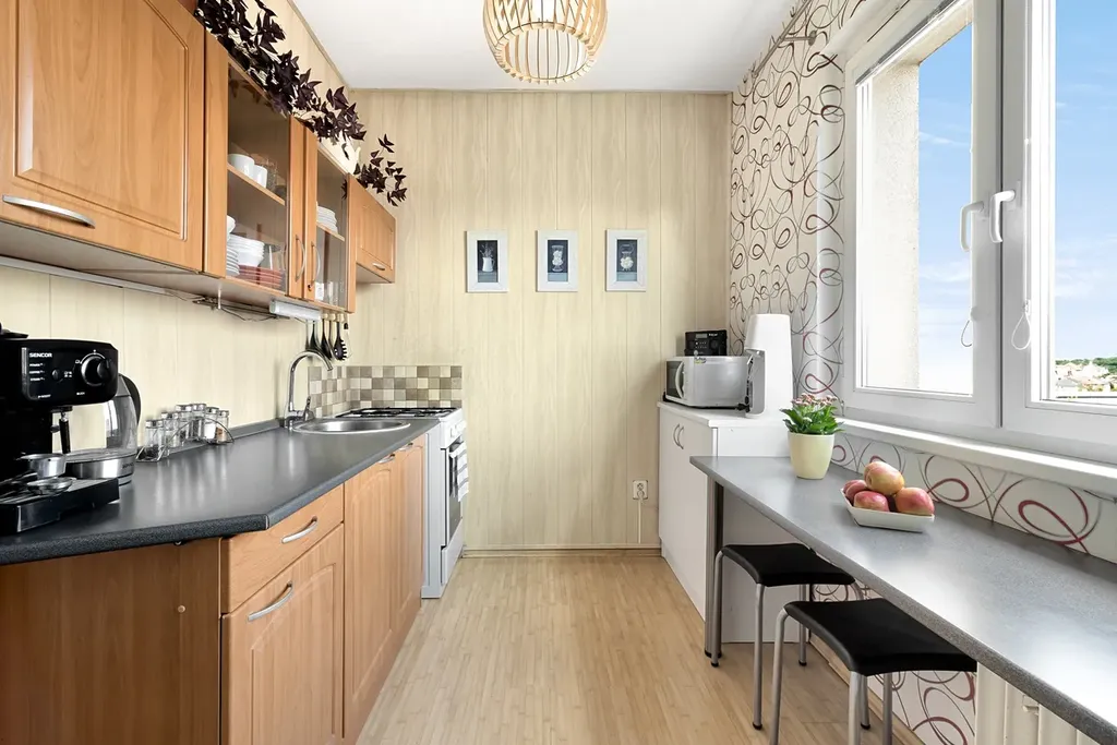 Dispozice zahrnuje vstupní předsíň s vestavěnými skříněmi, kuchyň, koupelnu, samostatné WC, obývací pokoj a ložnici – oba pokoje jsou průchozí. Kuchyně a ložnice jsou orientovány na východ, obývací pokoj na západ, díky čemuž je byt světlý a příjemný po celý den. V kuchyni je plynový sporák a původní, ale udržovaná kuchyňská linka. K bytu náleží i společný balkon na patře. Vytápění i ohřev vody jsou centrální.