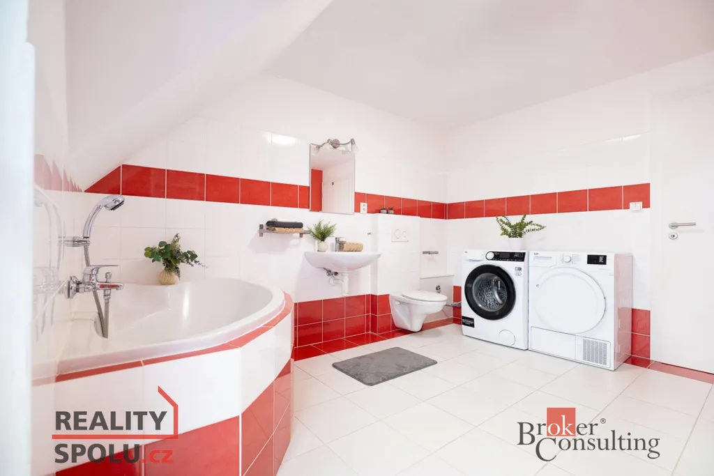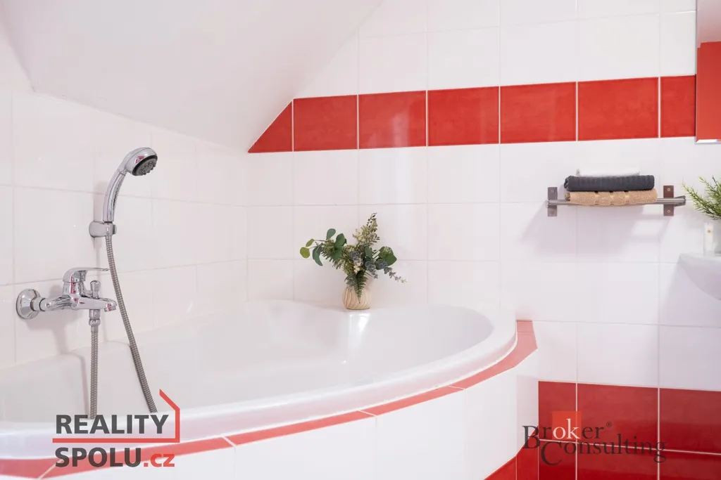 V patře najdete dva dětské pokoje, ložnici a prostornou koupelnu. Ze dvou pokojů je vstup na balkon. Další úložný prostor je pod hřebenem střechy.