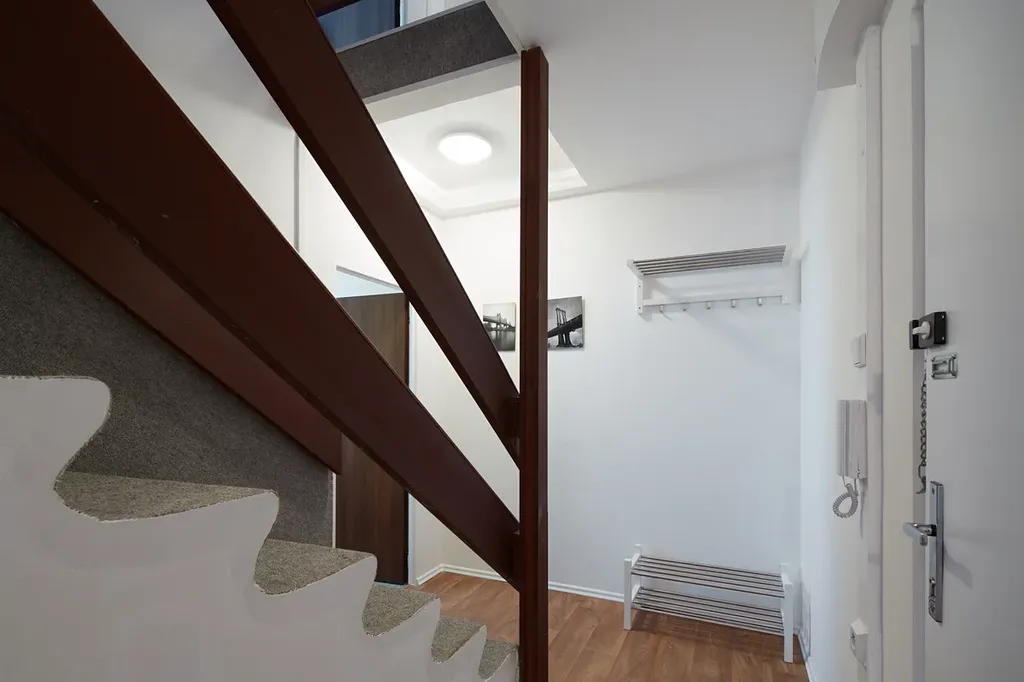 V bytě proběhla kompletní rekonstrukce několik let zpátky a nabízí velmi praktickou a variabilní dispozici. Dominantou je prostorný obývací pokoj, dále zde najdete čtyři neprůchozí pokoje, samostatnou kuchyni s jídelním koutem, komoru, koupelnu s vanou a zástěnou a dostatek úložných prostor. Díky mezonetovému řešení působí byt vzdušně, nabízí více soukromí a je vhodný jak pro rodinné bydlení, tak pro sdílené bydlení.