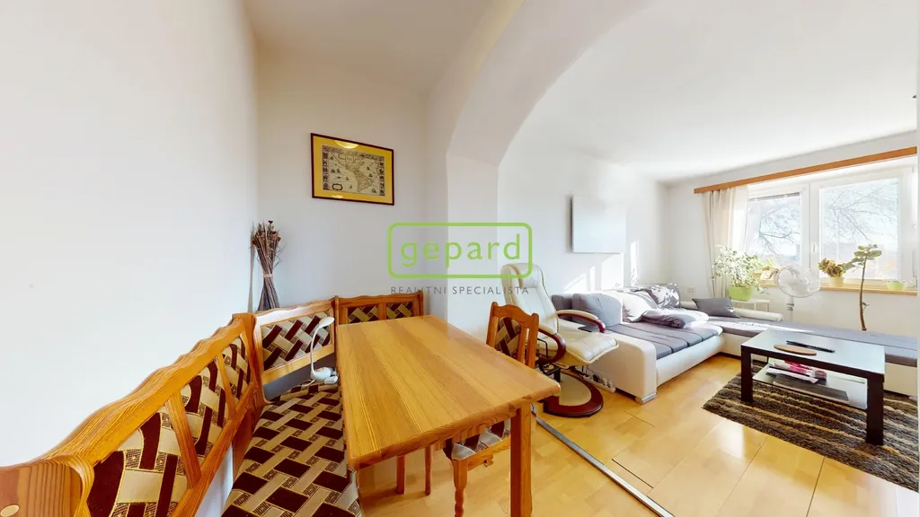 Při vstupu do bytu se nacházíme v chodbě, ze které máme po levé ruce dostačující kuchyni, ze které je vstup do koupelny a na samostatnou toaletu a po pravé ruce vstup do nynější ložnice. Dále na konci chodby je jídelní kout, po levé ruce menší místnost, možno využít jako pracovnu nebo dětský pokoj a vpravo prostorný obývací pokoj s funkčním krbem, který navodí tu pravou atmosféru útulného bydlení.
